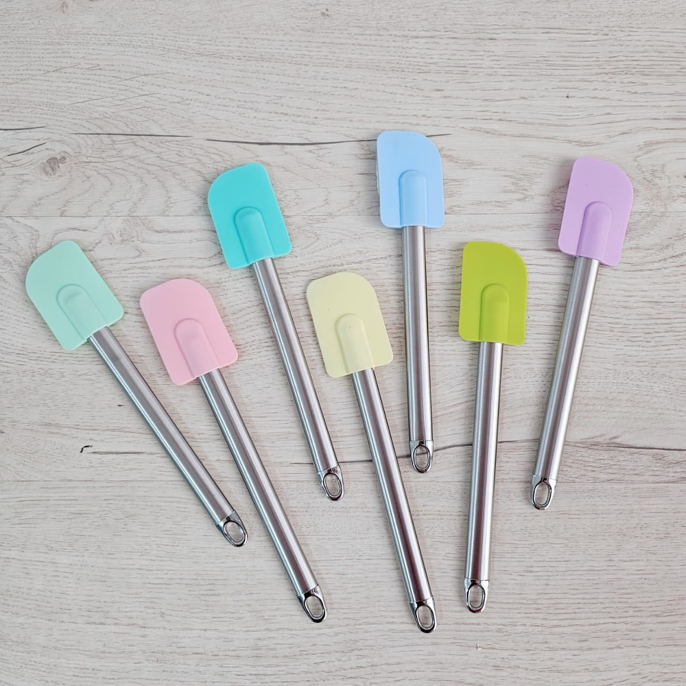 (Espátula con mango de acero inoxidable y con un acabado para colgar en plástico. Variedad en cuatro colores: verde, rosa, celeste y lila, todos tonos pasteles. Es desarmable, ya que se puede separar del mango para una mejor limpieza. Ideal para uso en repostería y pastelería. Perfecto a la hora de decorar tortas y postres. Categorizado en repostería.)