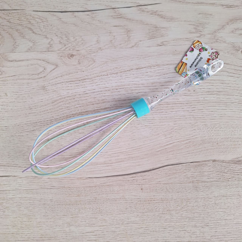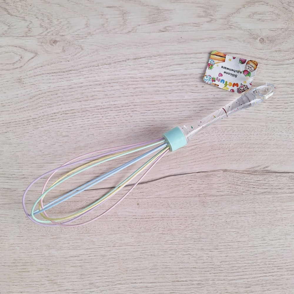 (Batidor de Silicona colores pasteles con mango de acrílico y glitter multicolores, en la punta del mango se halla un orificio para poder colgar.)