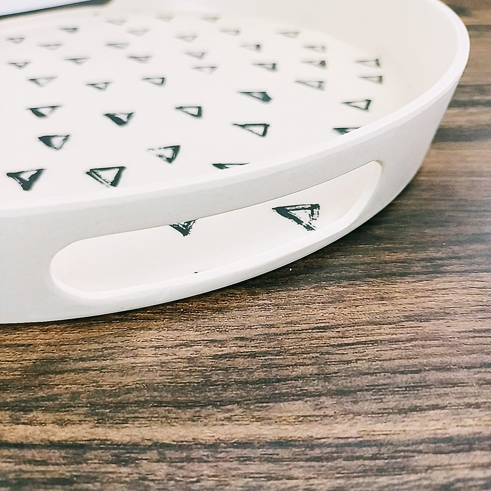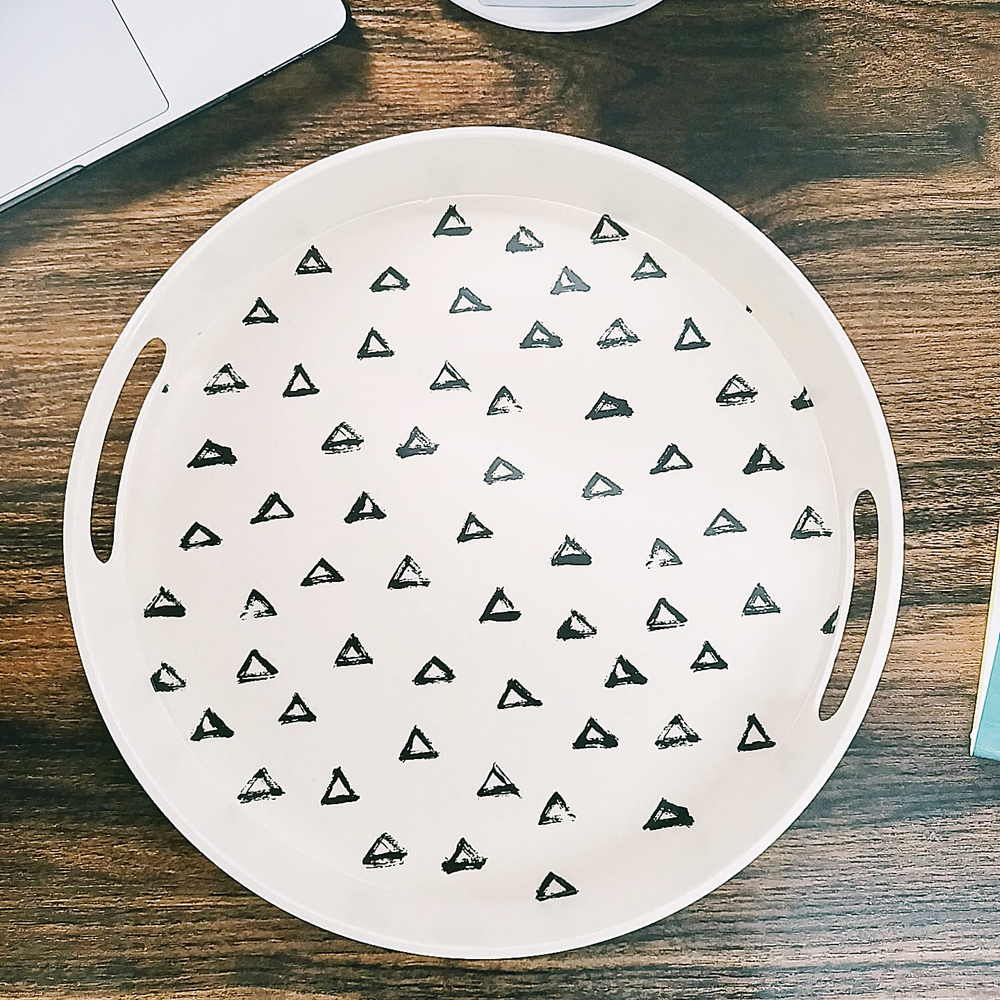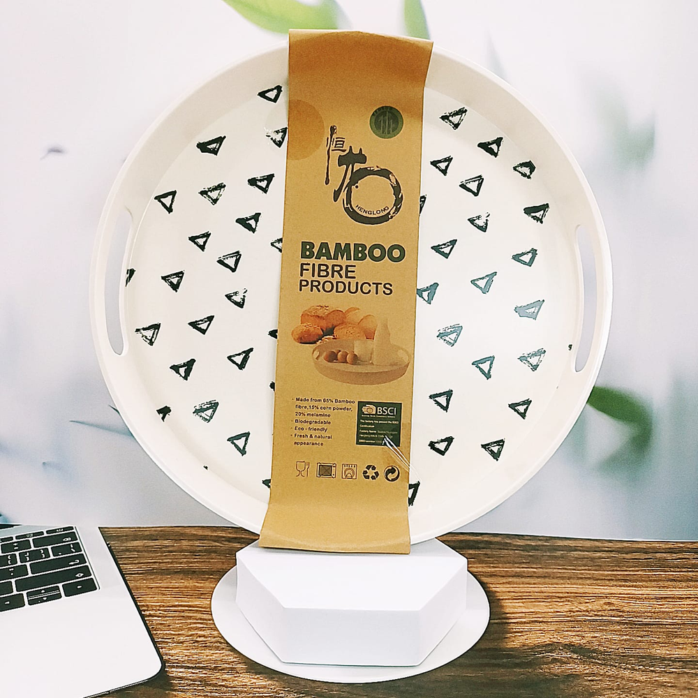 (Bandeja redonda estampada echa de fibra de bamboo, 65% bambú, 15% de harina de maíz, 20%melamina. Bandeja biodegradable respetuoso al medio ambiente. Aspecto fresco y natural).