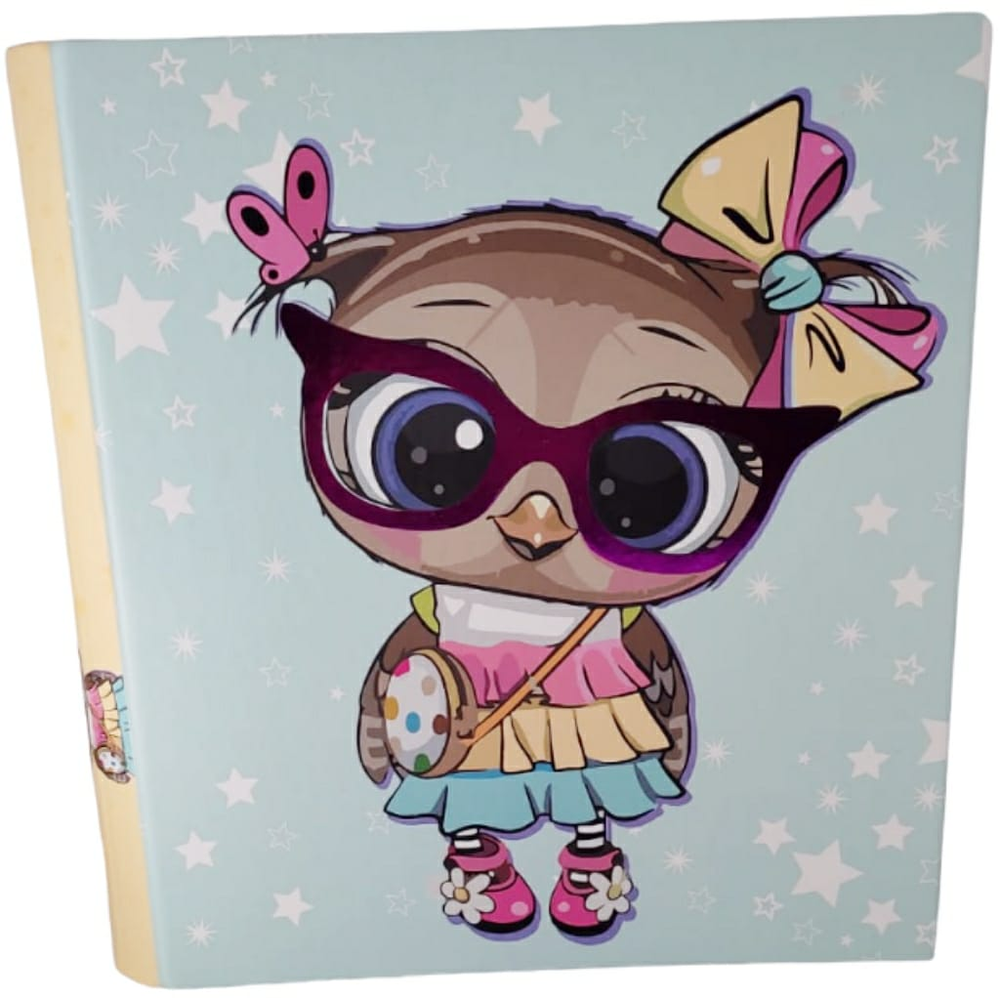 (Carpeta de diseño "Búho" de la marca "Cute", con 3 anillos de metal, en sus tapas interiores tiene secciones para completar datos personales y del colegio, además cuenta con una planilla de horarios. carpeta de colores pasteles estampado de animalitos).