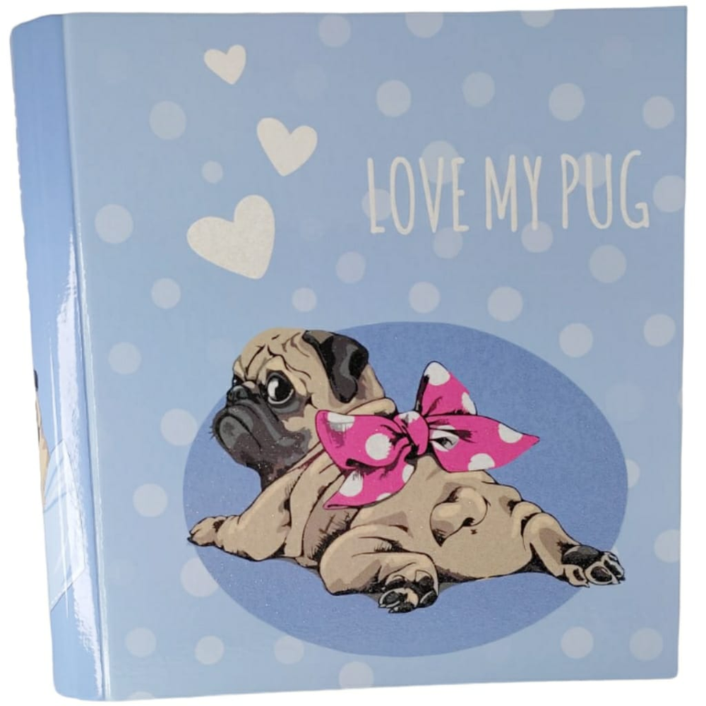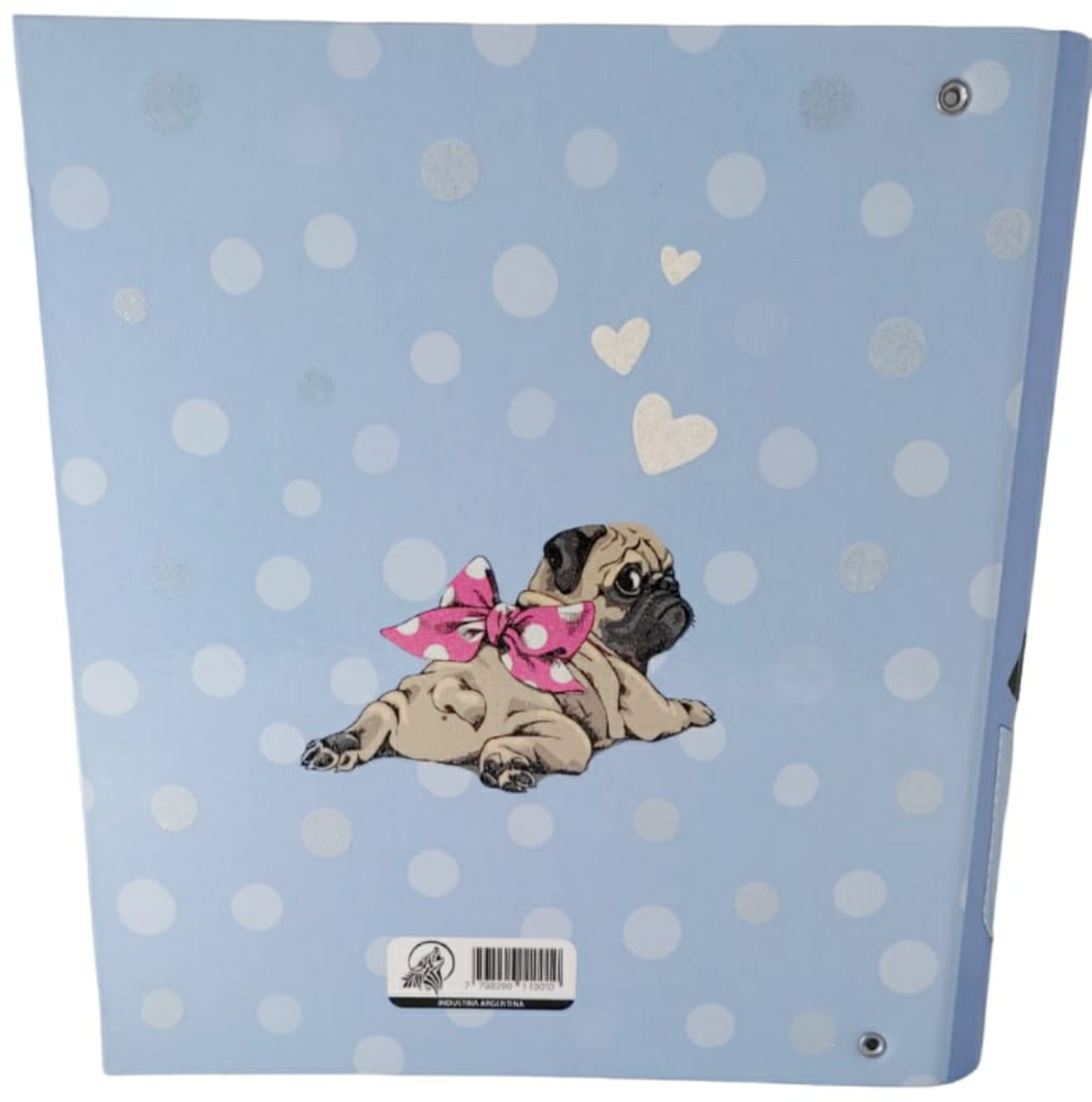(Carpeta de diseño "Love My Pug" de la marca "Cute", con 3 anillos de metal, en sus tapas interiores tiene secciones para completar datos personales y del colegio, además cuenta con una planilla de horarios. carpeta de colores celeste estampado de animalitos).