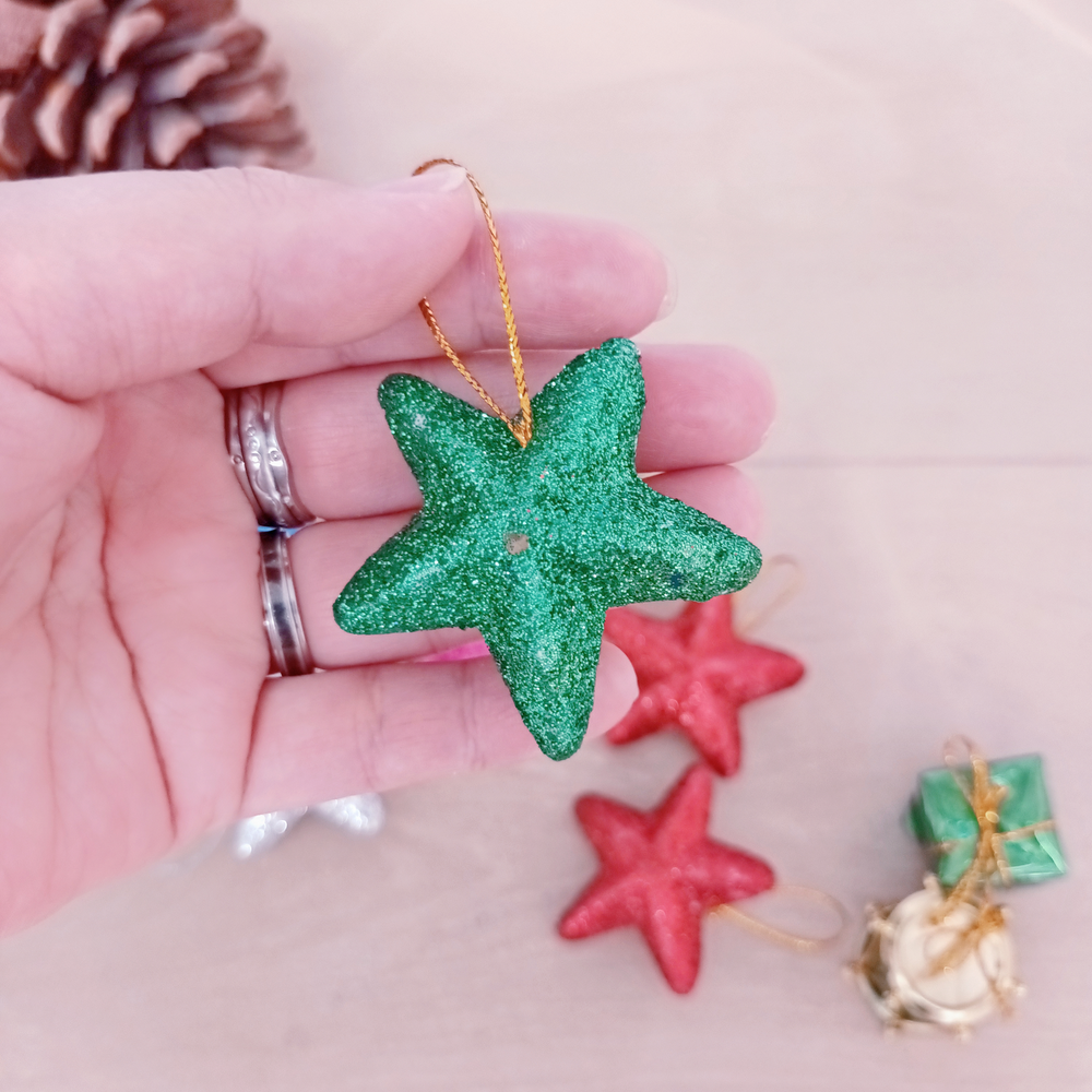 (Adorno colgante de telgopor con forma de estrella decorado con glitter. Pack por 6 unidades en colores surtidos).
