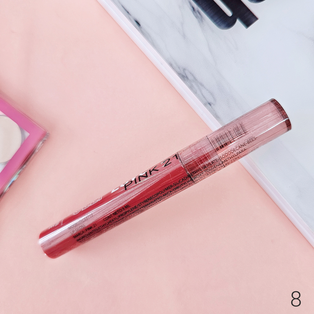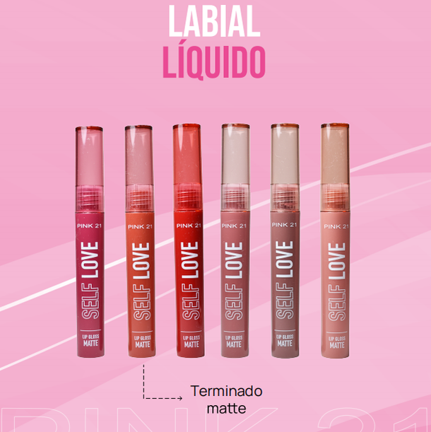 (Lip Gloss Matte linea Self Love marca "Pink 21", disponible en 12 colores mattes).