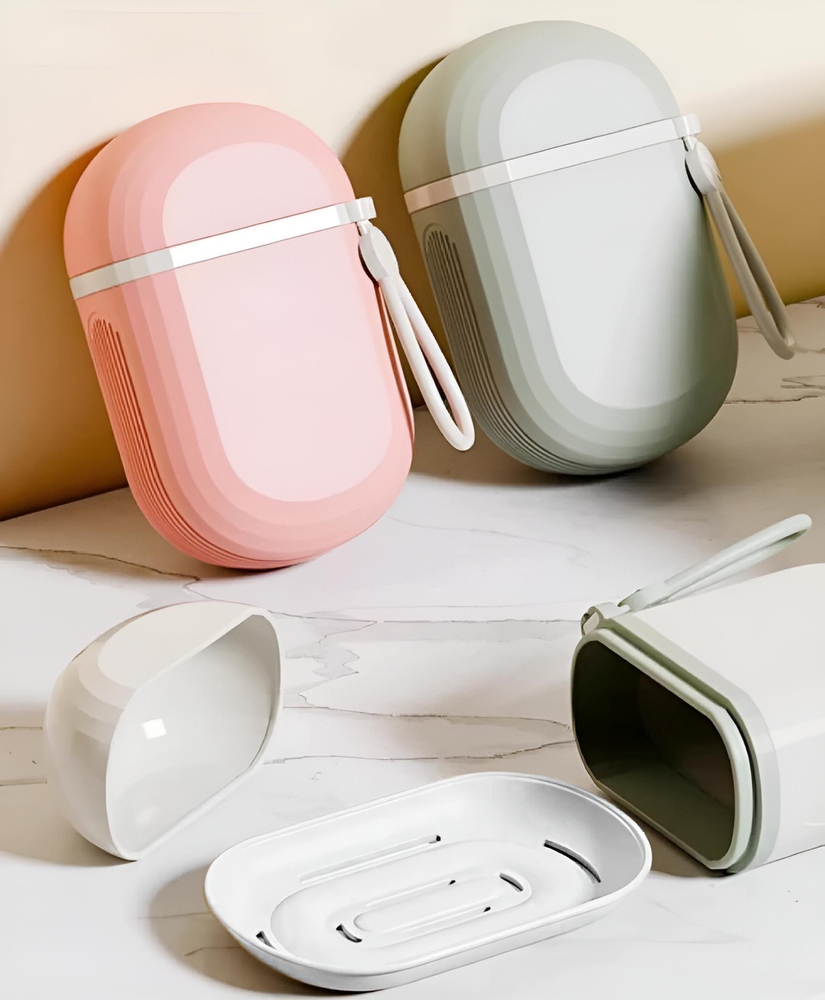 (Jabonera con tapa diseñada ideal para viajar, cuenta con una bandeja en el interior para apoyar jabón y trae una correa para un mejor agarre).
