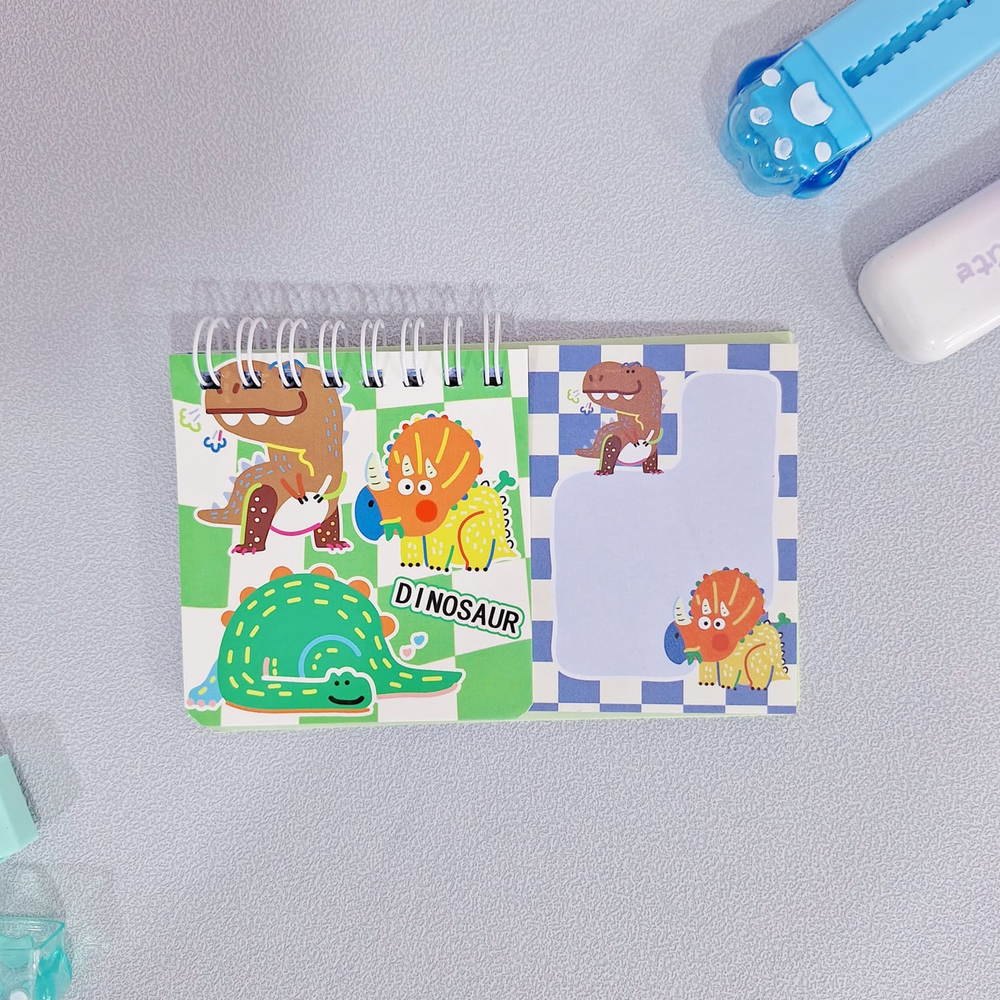 (Set de libreria con diseño de dinosaurios supertierno, este cuenta con una mini libreta y ademas unos post tips adhesivos a juego).