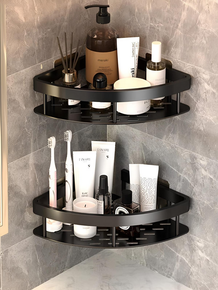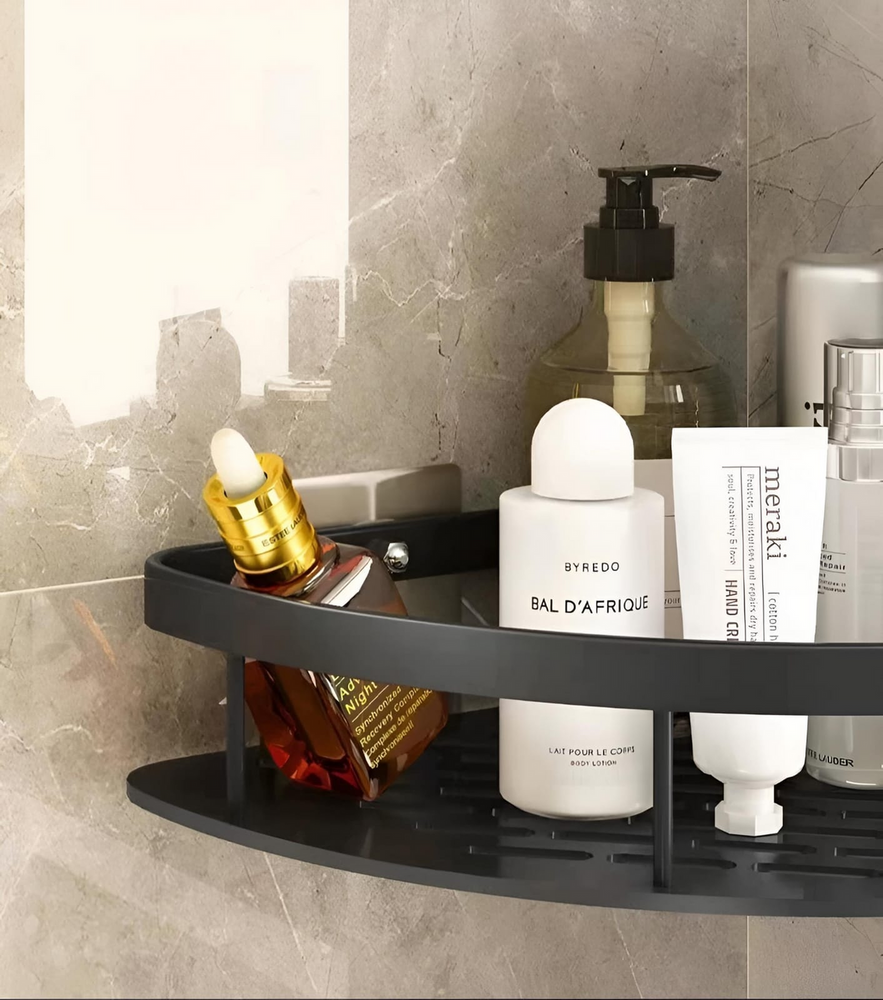 (Estante organizador para baño, echo de un material resistente el cual permite soportar peso, ideal para colocar tus productos y tenerlos al alcance. Viene con diseño de drenaje que evita que se acumule agua. Incluye 2 tornillos y 2 ganchos adhesivos para su fácil y rápida colocación, no daña la pared. Disponible en color negro).