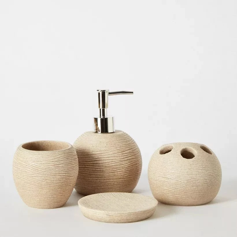 (Cuenta con 4 piezas: un dispenser, una jabonera, un portacepillos y un vaso de uso versátil. Ideal para dar un estilo más natural y elegante a tu baño).