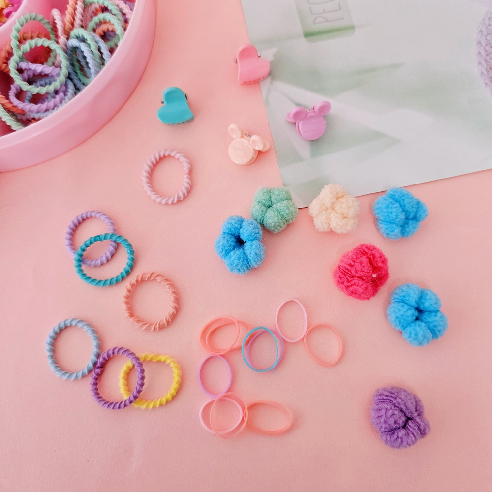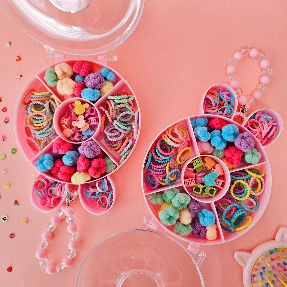 (Este kit viene en forma de una carterita con diseño de conejo y trae con colita, brochecito y gomitas elásticas, muy ideal para hacer cualquier tipo de look para su niña).