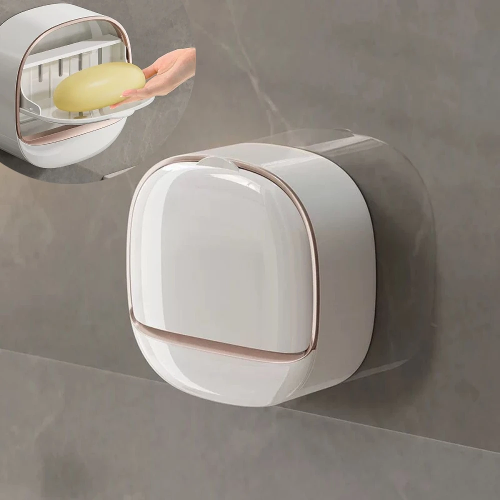 (Jabonera con Tapa, cuenta con drenaje y una bandeja en la parte de abajo que junta el agua, trae consigo un gancho de cinta adhesiva sin necesidad de dañar la pared).