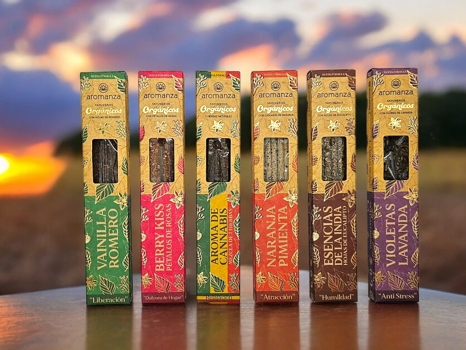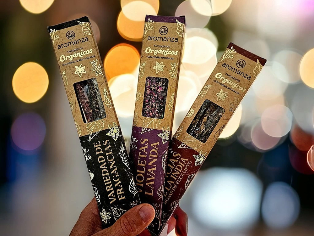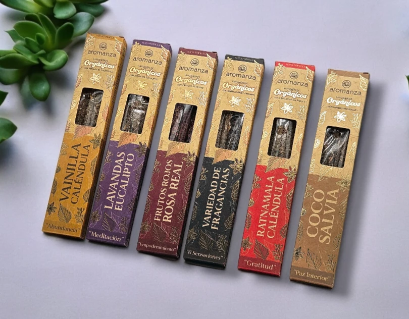 (Caja de Sahumerios Orgánicos x 6U. "Aromanza", en 10 diferentes variedades de sahumerios con hierbas, pétalos y cascacras naturales. Dura 40min de aroma intenso. Cada caja trae un mensaje inspirador).