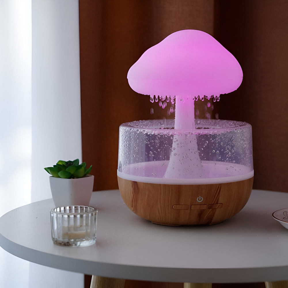 (Lámpara + humidificador con simulación de lluvia. Cuenta con 7 diferentes tipos de luces, 3 niveles de velocidad del flujo del agua y es recargable vía USB (incluido). Además posee 3 modos: modo 1 (luces led y lluvia), modo 2 (solo lluvia) y modo 3 (solo luces led). Ideal para ambientar tu espacio y purificar el ambiente).