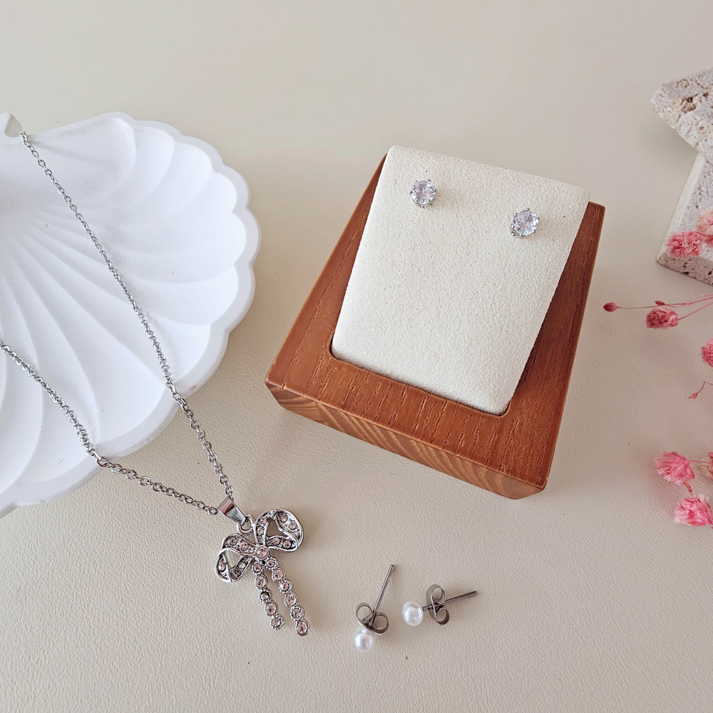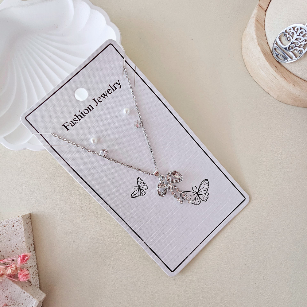 (Este set cuenta con 2 pares de aritos: perlas y strass, un collar y un dije con diseño elegante y estético. Ideal para resaltar tu belleza y atuendo).