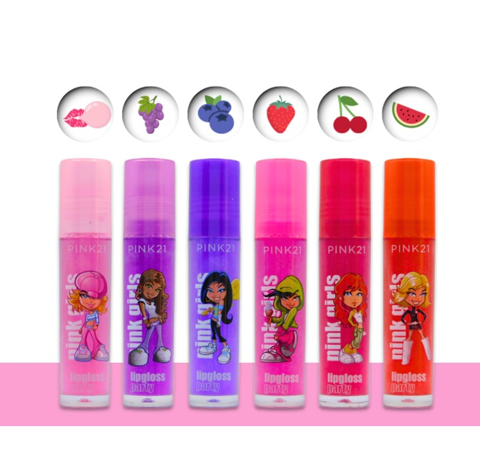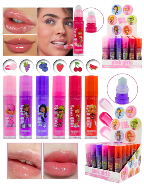 (Caja x 36U. Lipgloss Pink Girls marca "Pink 21". Cuenta con 6 labiales con aromas diferentes. Ideal para mantener tus labios hidratados).