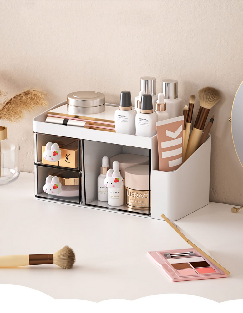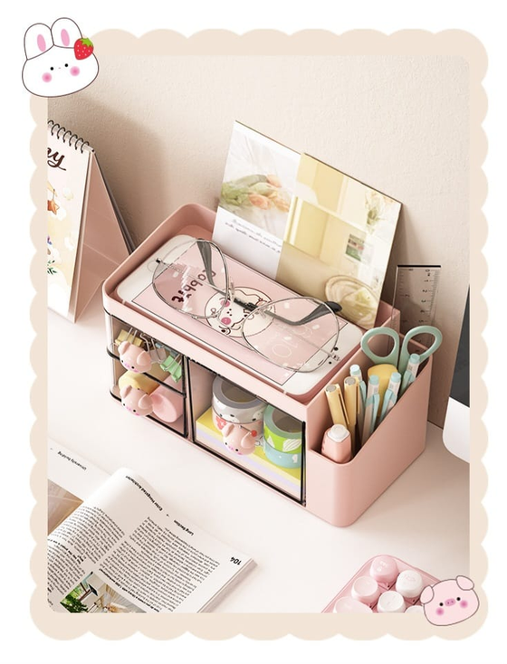 (Organizador de escritorio super tierno. Cuenta con 3 cajones, un compartimento lateral y una superficie plana en la parte superior. Ideal para almacenar maquillaje, pinceles, útiles escolares, etc).