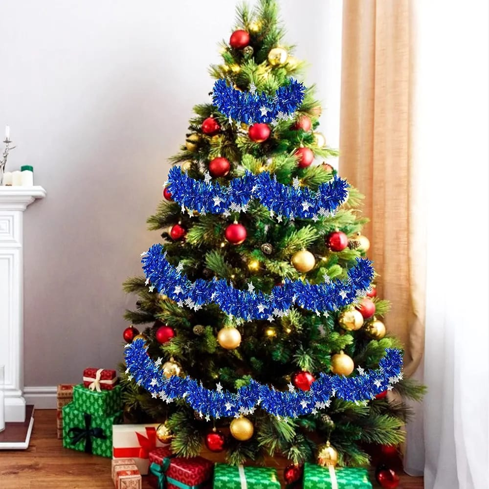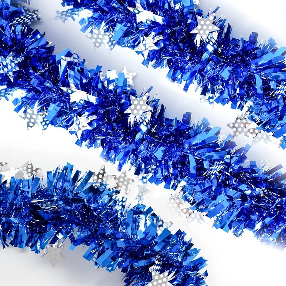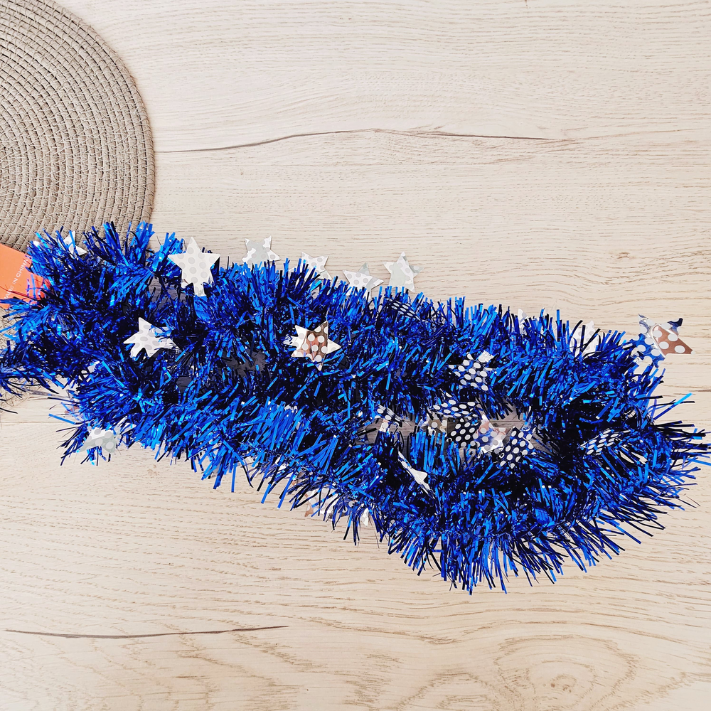 (Esta guirnalda cuenta con un diseño de color azul metálico y estrellas plateadas con lunares. Ideal para decorar tu hogar en estas fiestas).