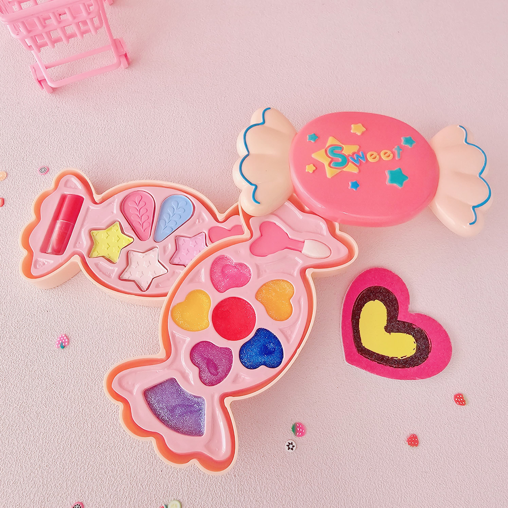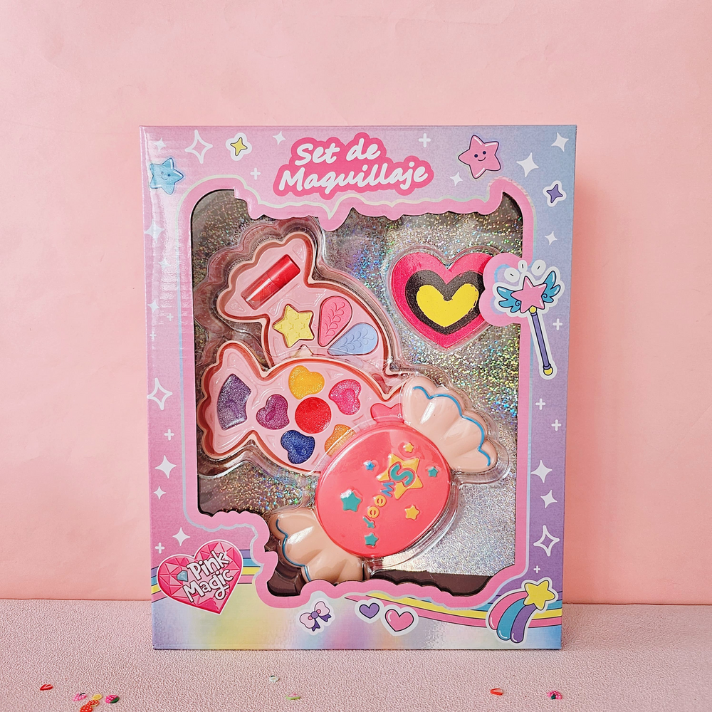 (Set de maquillaje con estuche en forma de caramelo, posee 2 pisos de maquillaje. Contiene 2 aplicadores, 5 sombras satinado, 7 labiales con brillo, 1 labial retráctil y una lima para uñas en forma de corazón. Ideal para divertirse jugando).