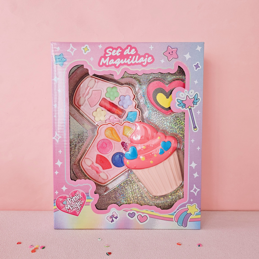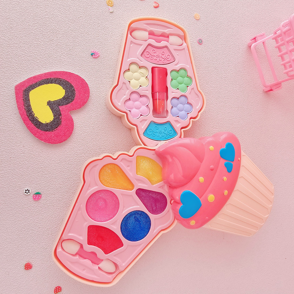 (Set de maquillaje con estuche en forma de helado, posee 2 pisos de maquillaje y una lima para uñas. Contiene 2 aplicadores, 6 sombras satinado, 6 labiales con brillo y 1 labial retráctil. Ideal para divertirse jugando).