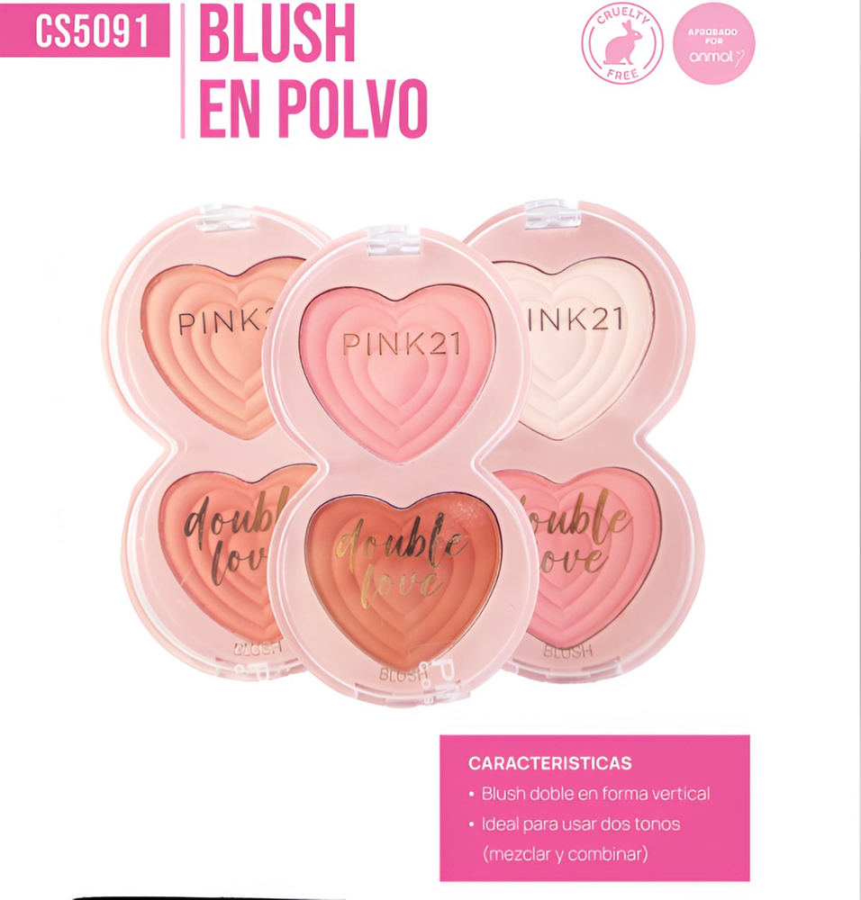 (Double Love Blush marca "Pink 21". Cuenta con 2 rubores cada uno y vienen 3 modelos de diferentes tonalidades a elección. Ideal para definir rasgos y darle a la piel un punto de color extra).