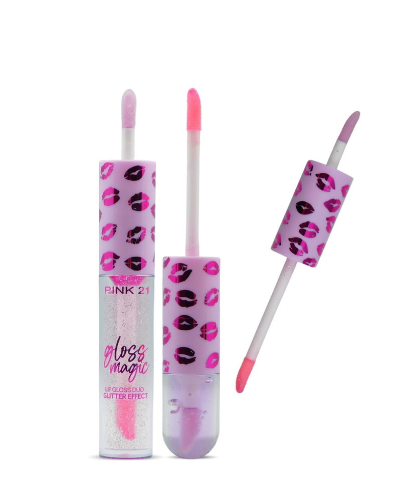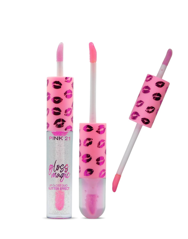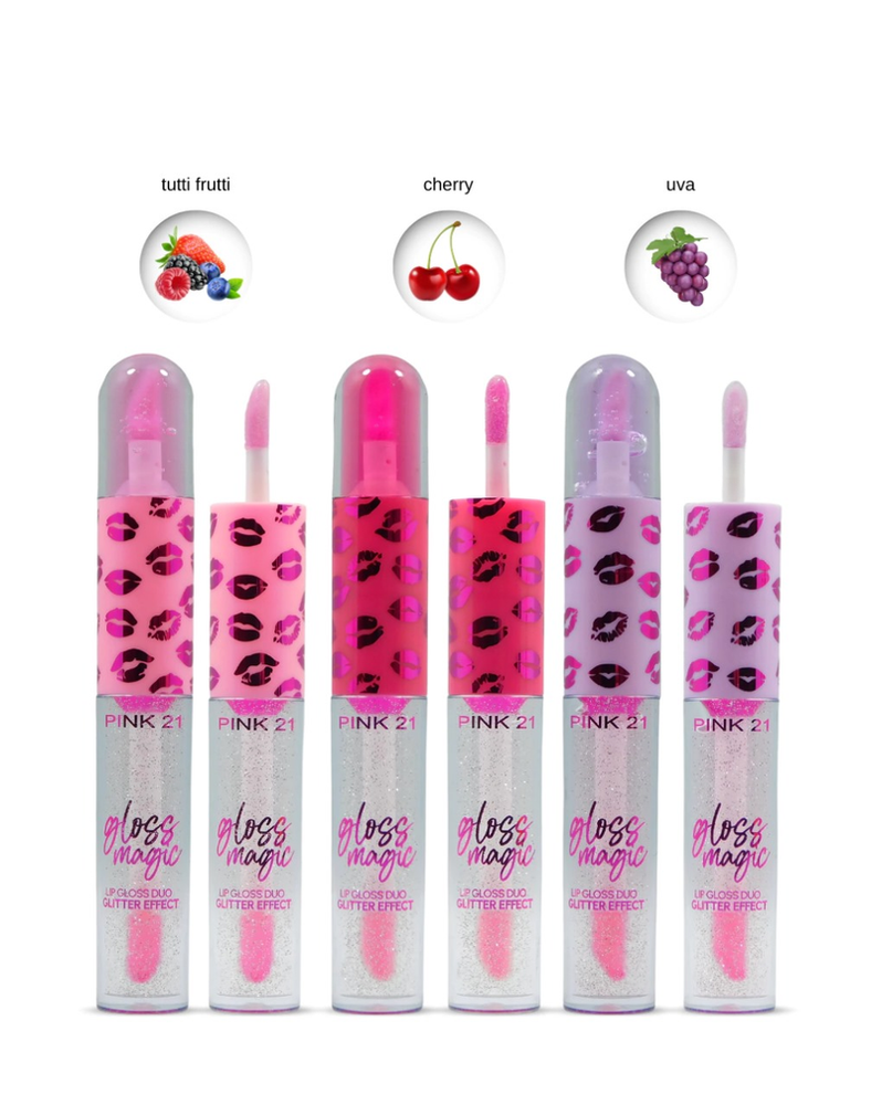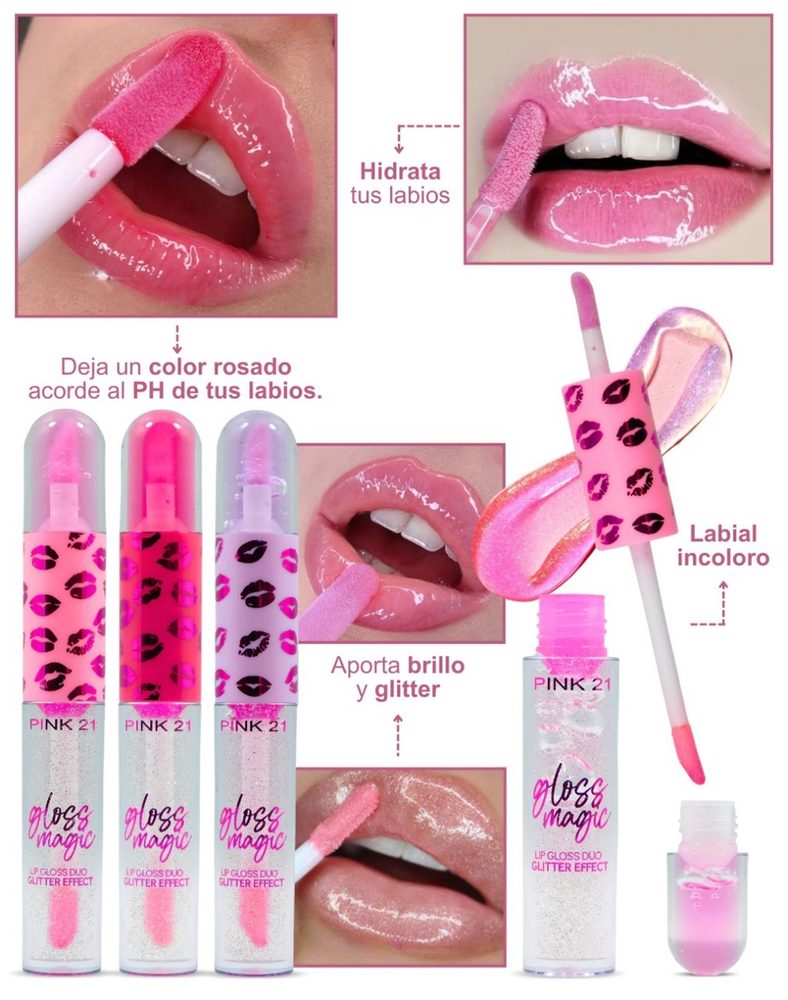 (Brillo Labial Duo "Pink 21", gloss translúcido y otro con brillos. 3 Sabores diferentes).
