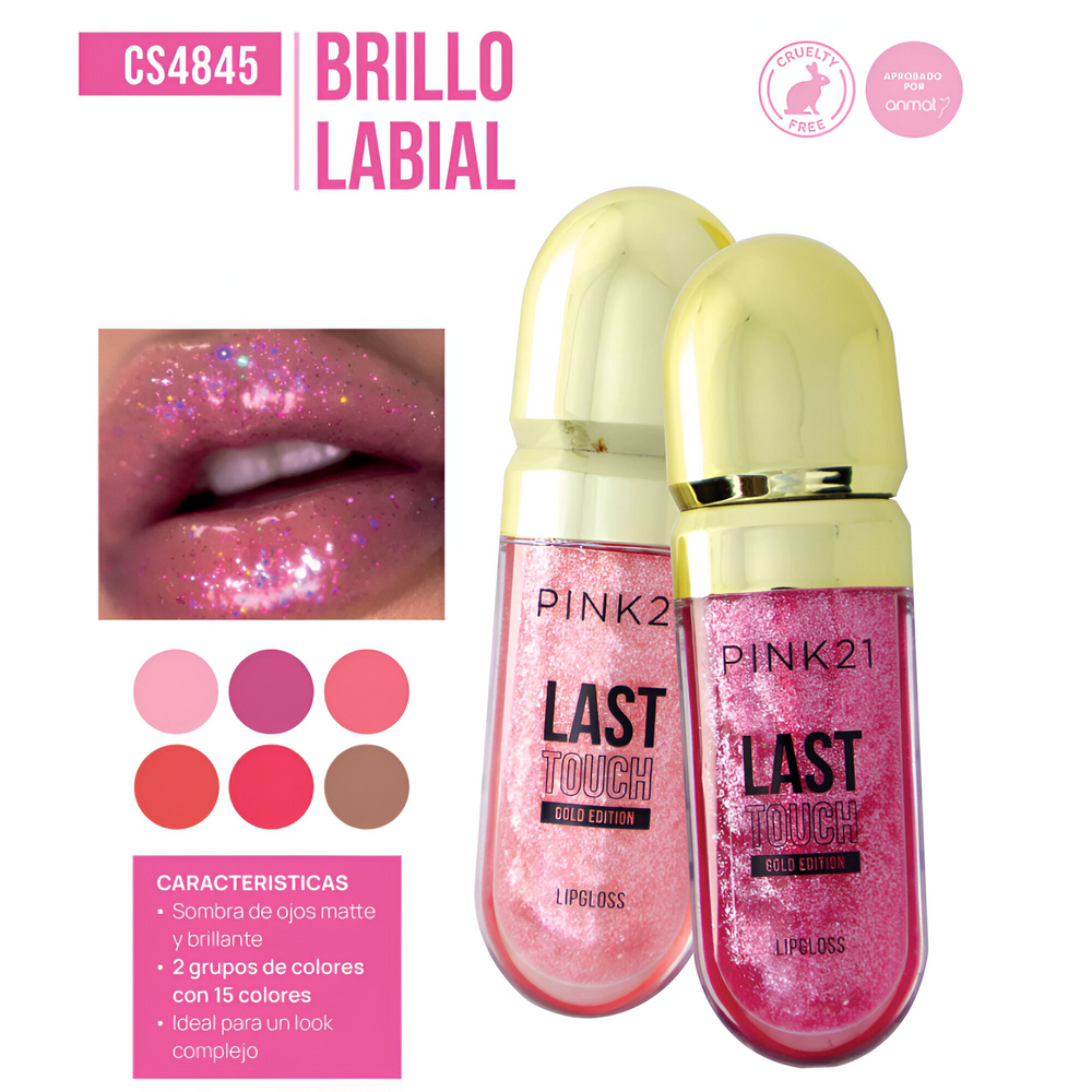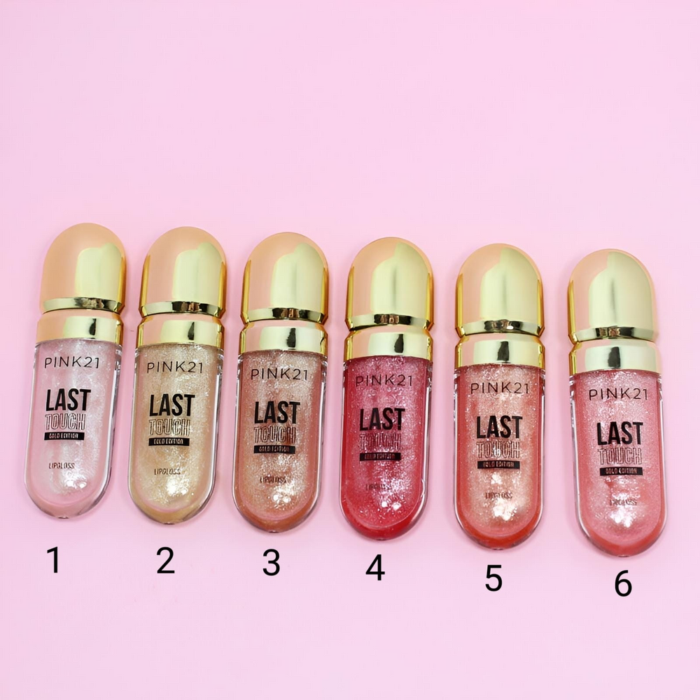 (Brillo labial Last Touch marca "Pink 21". Brinda un efecto brillante y tiene una capacidad de 7ML, aprox. Vienen 6 modelos diferentes a elección. Ideal para hidratar y darle brillo a tus labios).