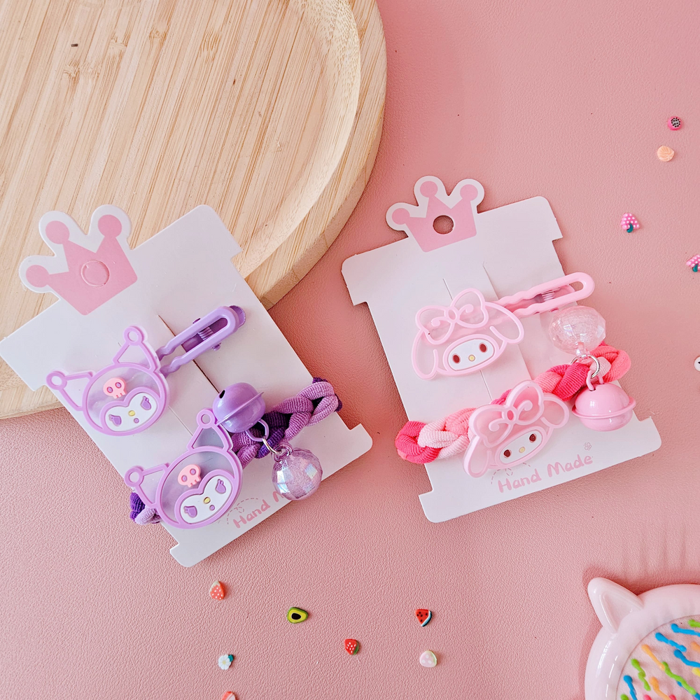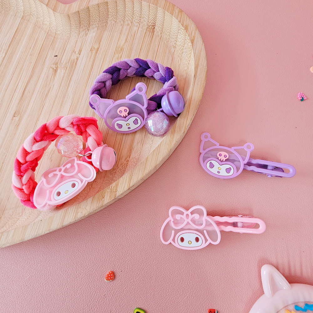 (Cada blister cuenta con una hebilla y una colita super bonita con accesorios de "Kuromi" y My Melody". Vienen 2 modelos diferentes. Ideal para resaltar tu cabello).
