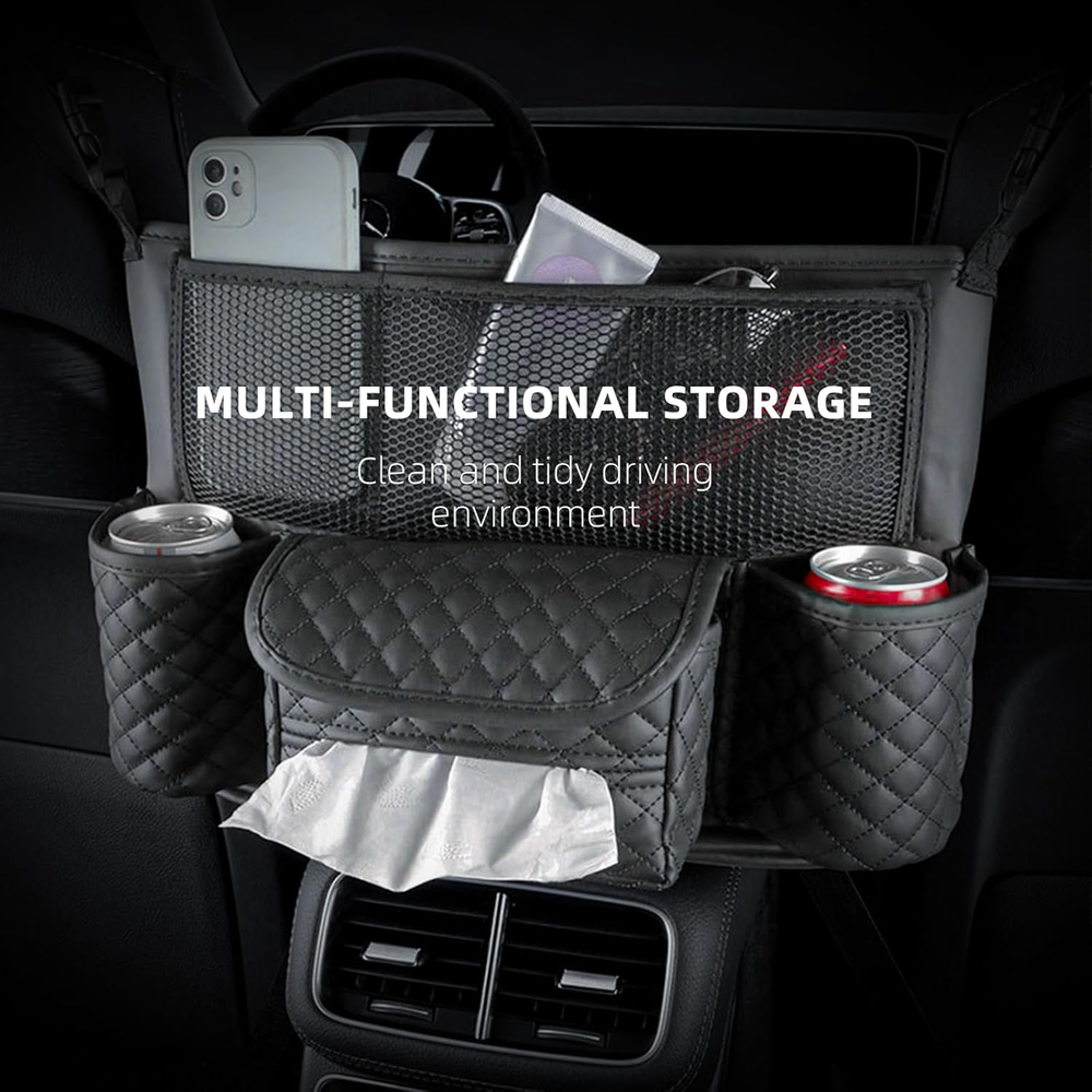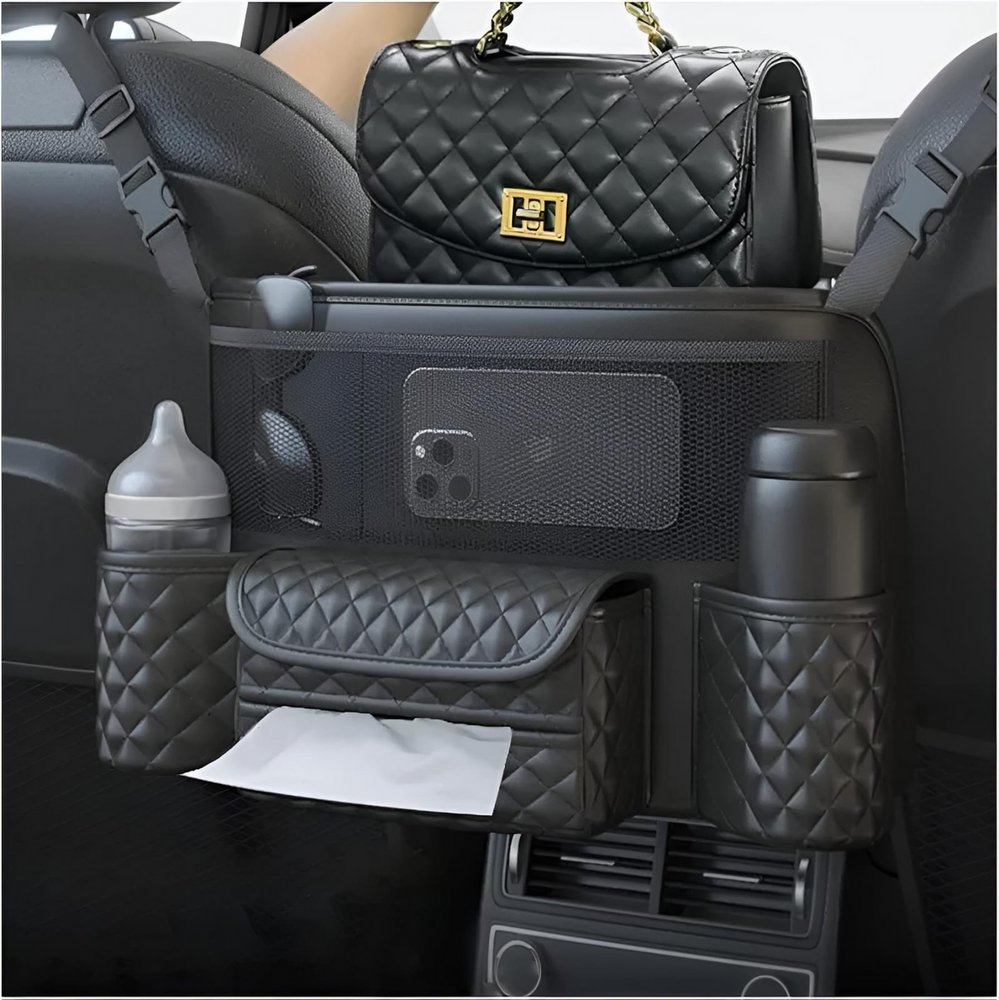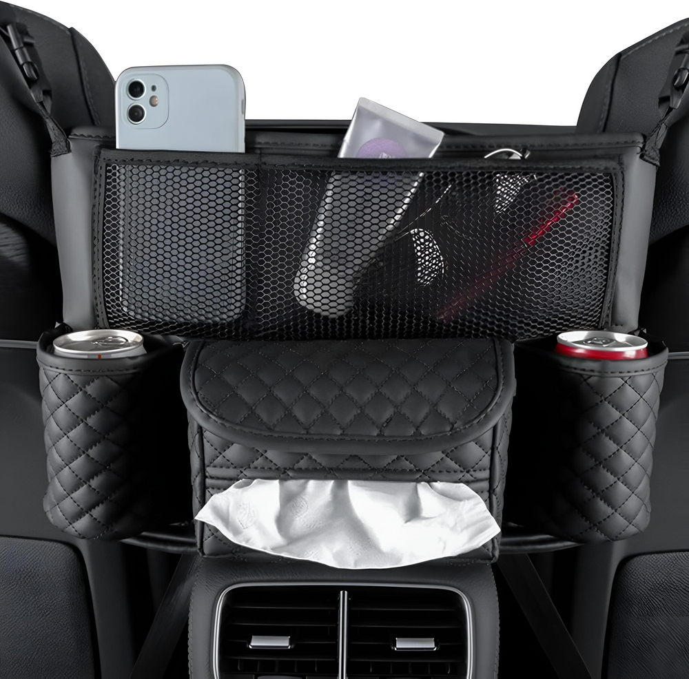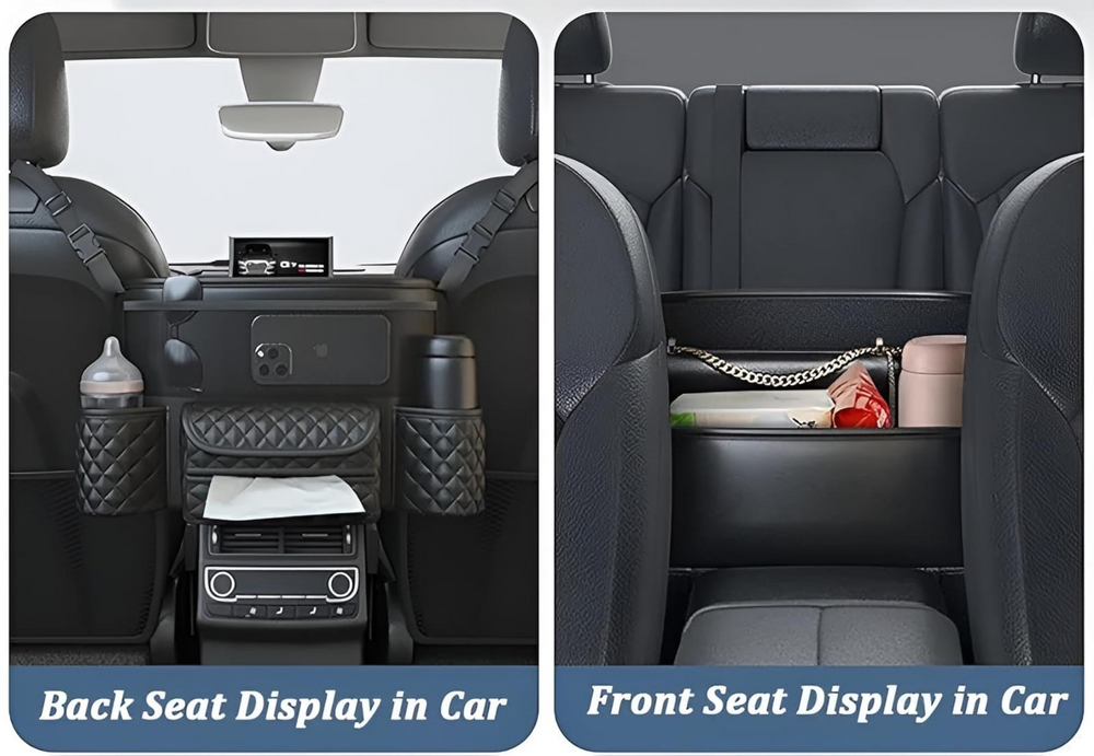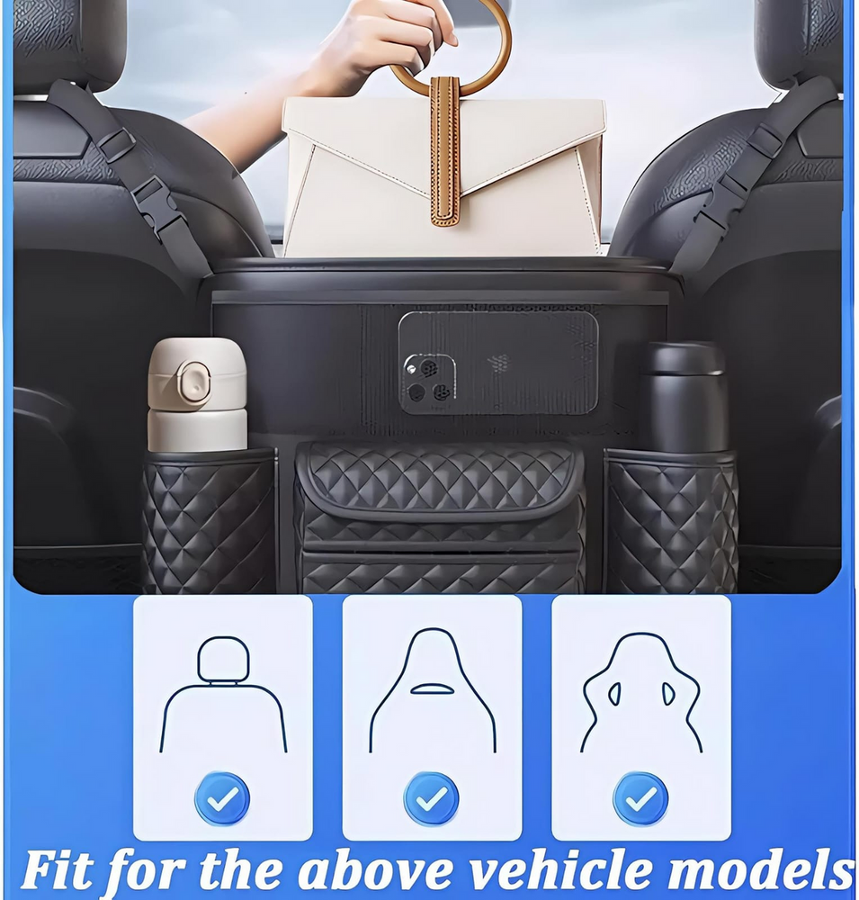 (Organizador respaldo de asiento para coche, material de alta calidad, cuenta con multiples compartimientos ideal para almacenar cualquier producto que deseea. Súper versatil, cuenta con un soporte para guardar pañuelos, documentos, celulares, botellas y la parte porterior trae también un corpartimiento para guardar carteras. Exceleste articulo infaltable para tu coche).