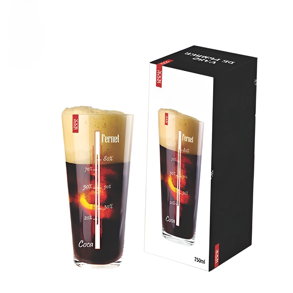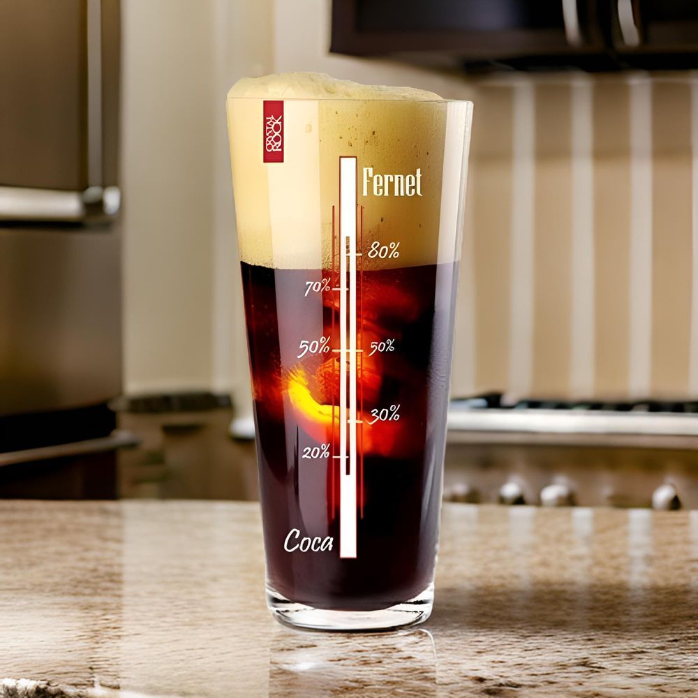 (Vaso para fernet de 750ml, trae las medidas ideales para preparar un buen fernet. De un lado de la línea están las medidas para la cola y el otro lado están las medidas para el fernet).