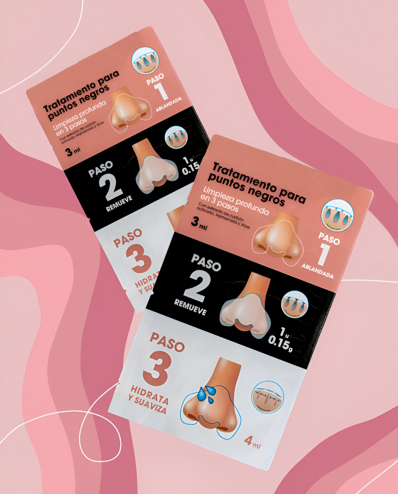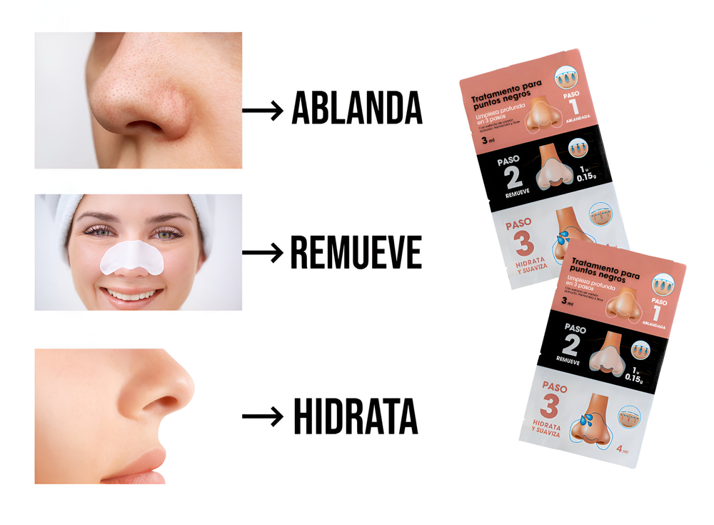 (Tratamiento de limpieza profunda en 3 pasos. El primer paso ablanda los poros y puntos negros, El segundo los remueve y él elimina el exceso de oleosidad y suciedad que obstruyen los poros, por último el tercer paso hidrata y suaviza, devolviendo el equilibrio natural de la piel).