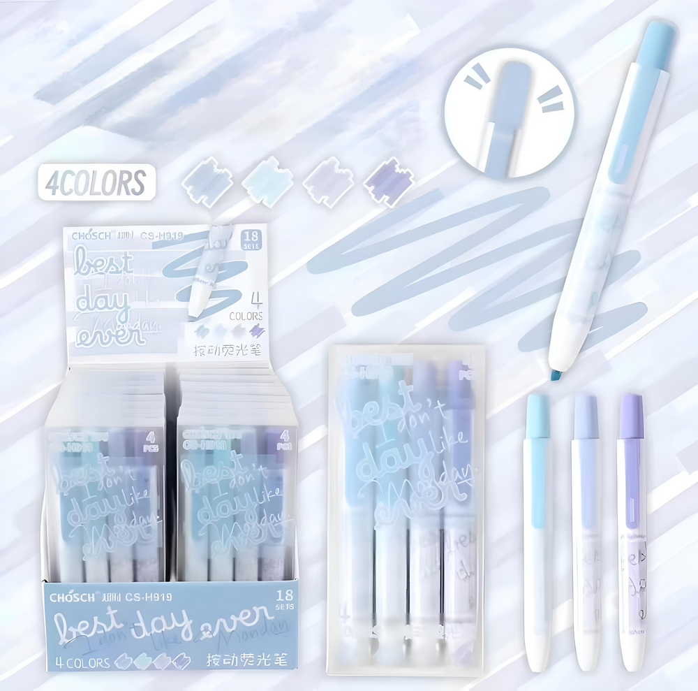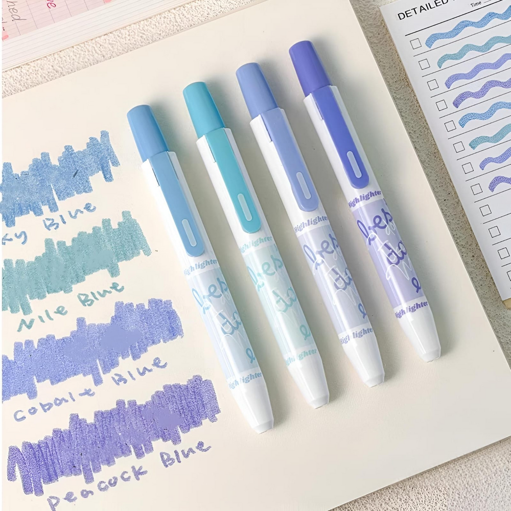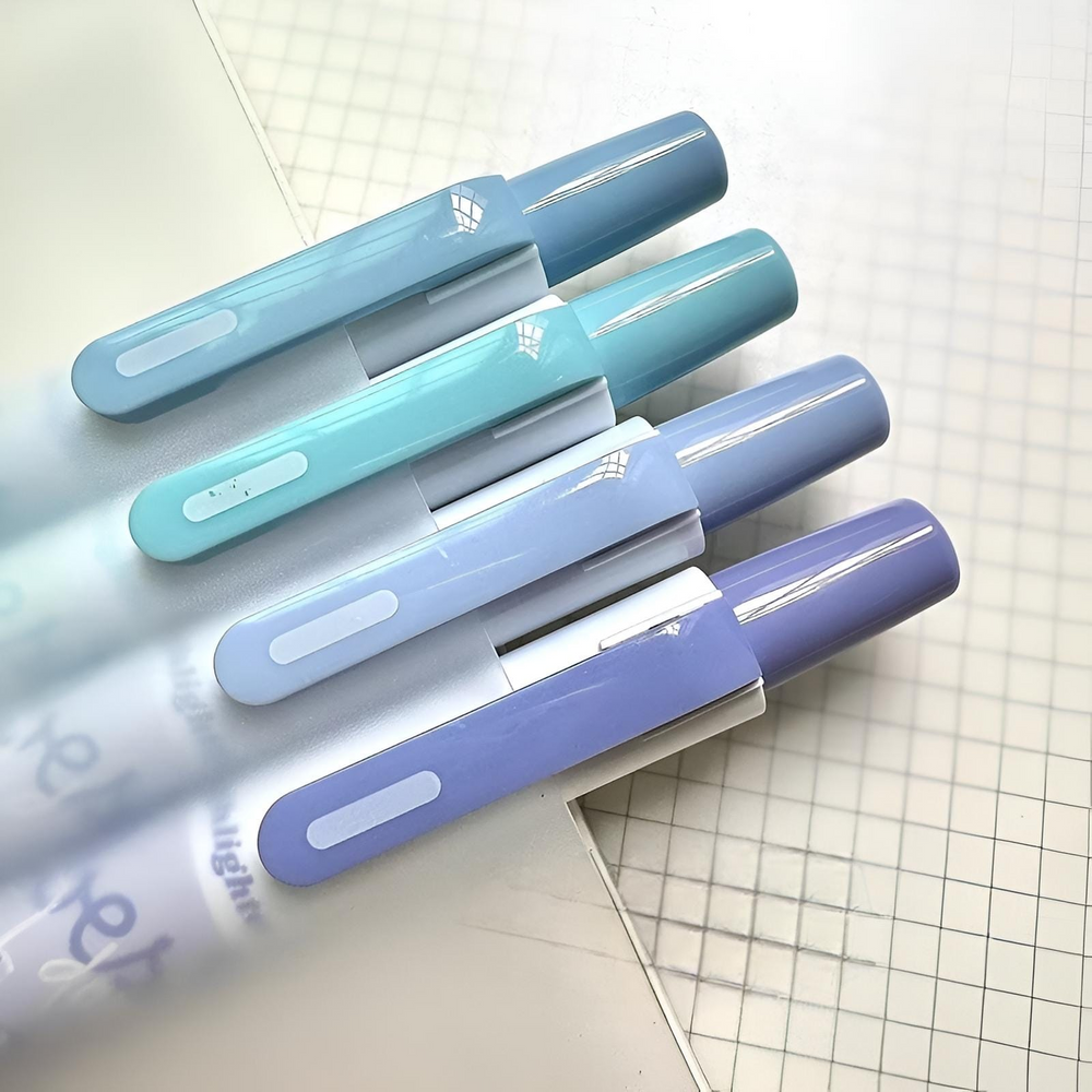 (Set x 4 resaltadores retractiles en distintos tonos de azul, la misma cuenta con clips para enganchar en el lugar que desees. Ideal regalar o resaltar tus apuntes de la manera mas linda).