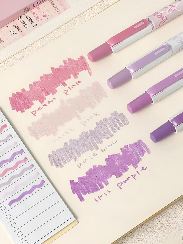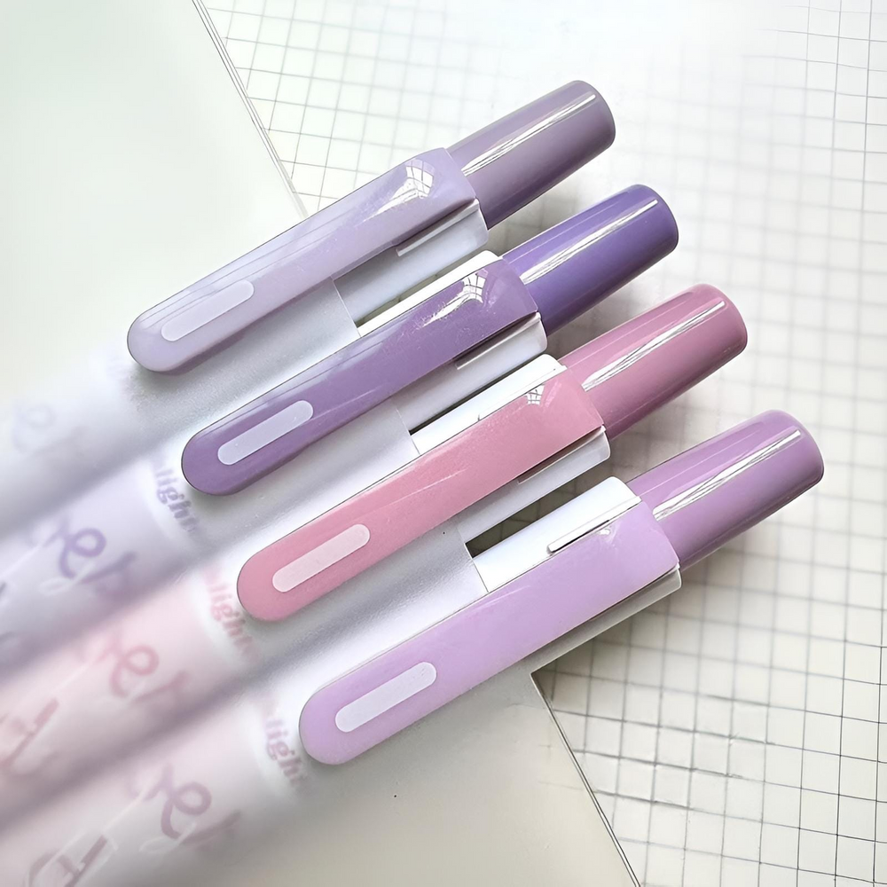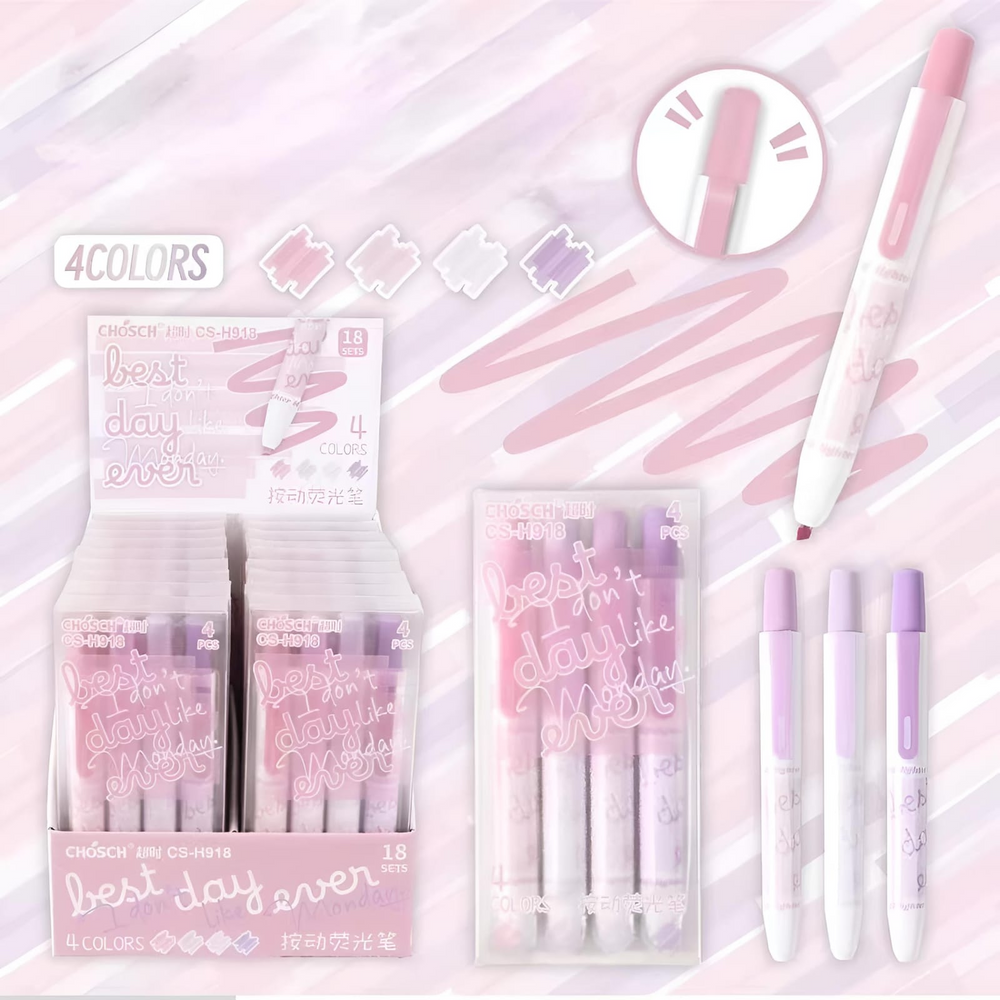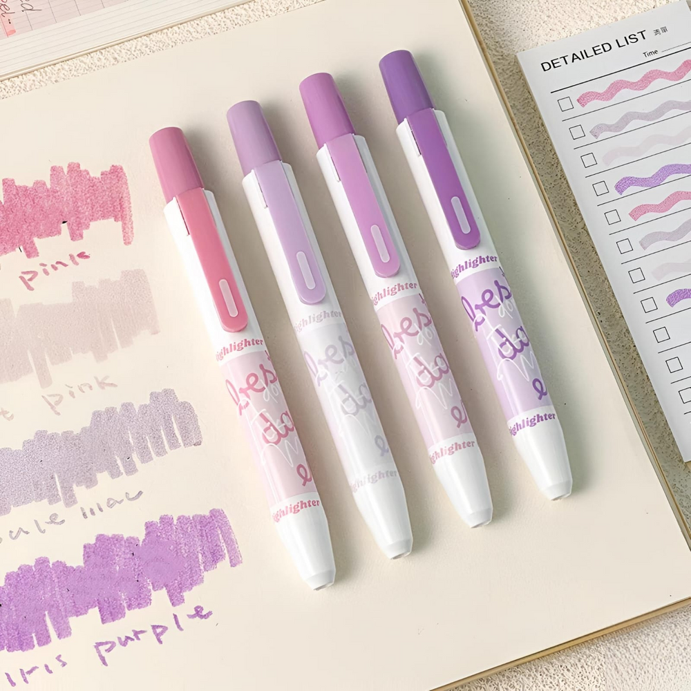 (Set x 4 resaltadores retractiles en tonos rosa y violeta, la misma cuenta con clips para enganchar en el lugar que desees. Ideal regalar o resaltar tus apuntes de la manera mas linda).