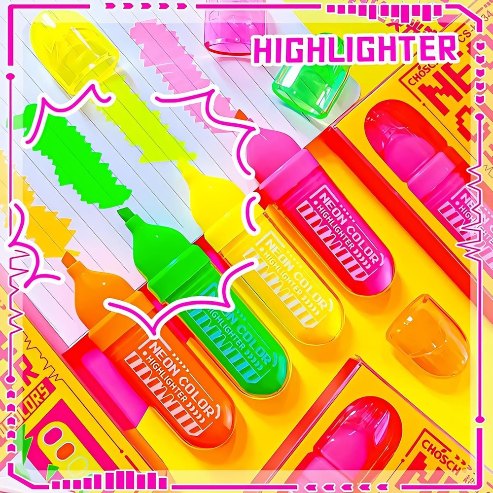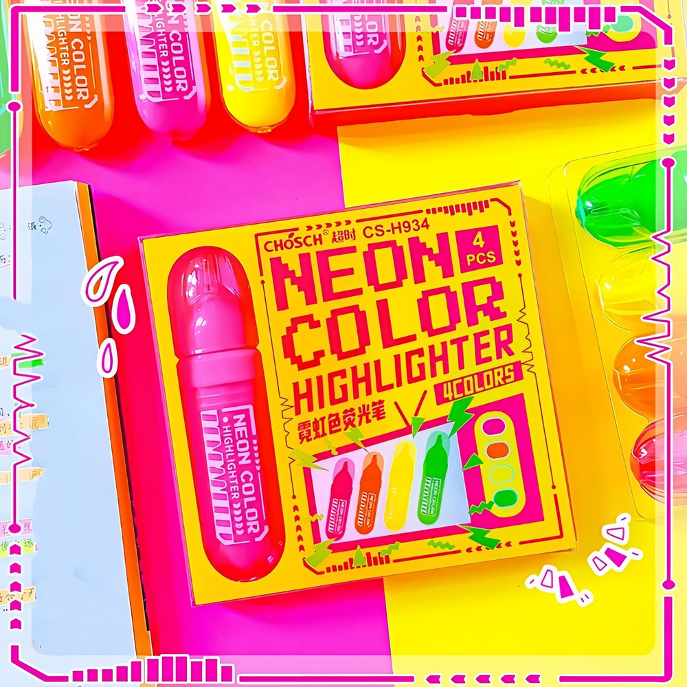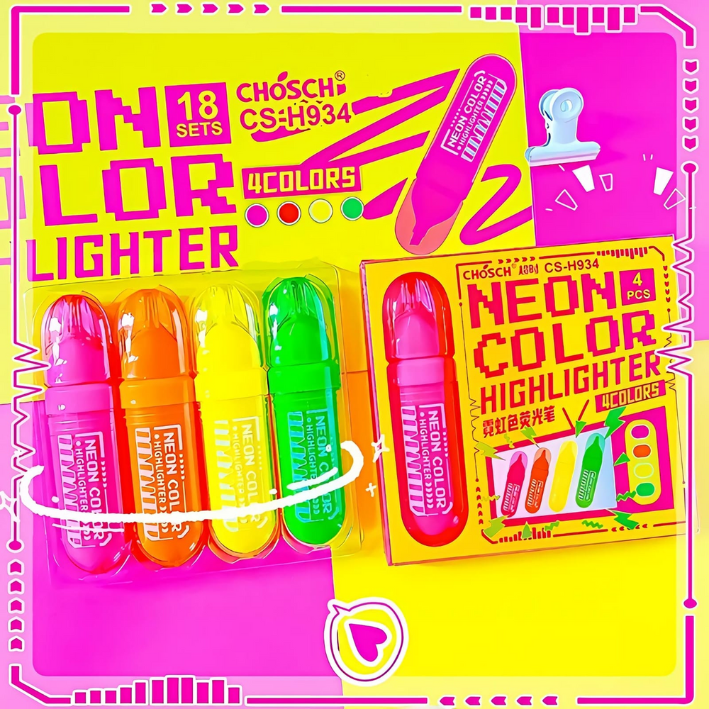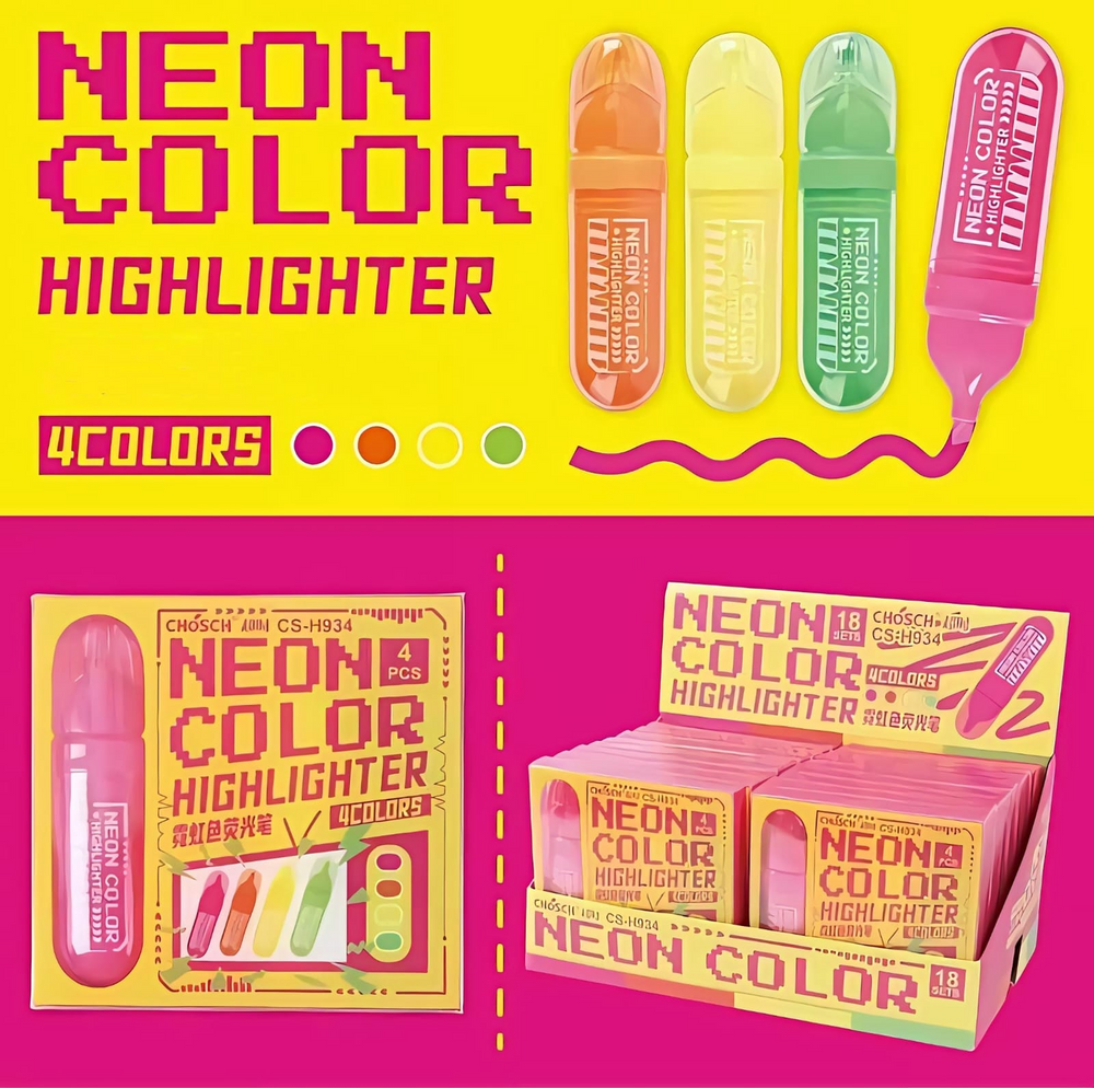 (Set de 4 resaltadores neón en diferentes tonos, colores intensos y de alta durabilidad. Ideales para uso escolar).