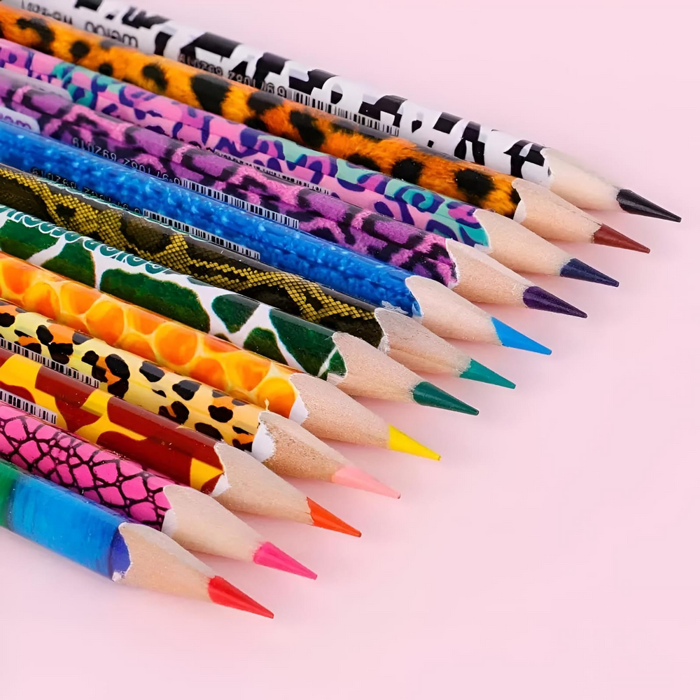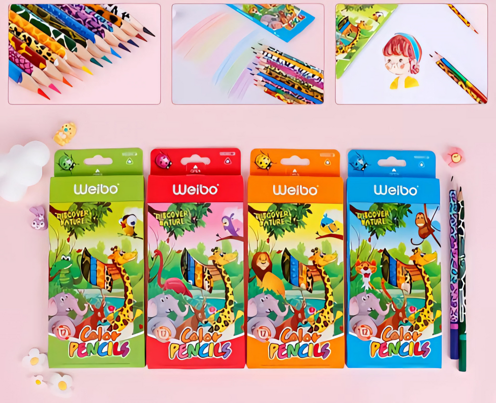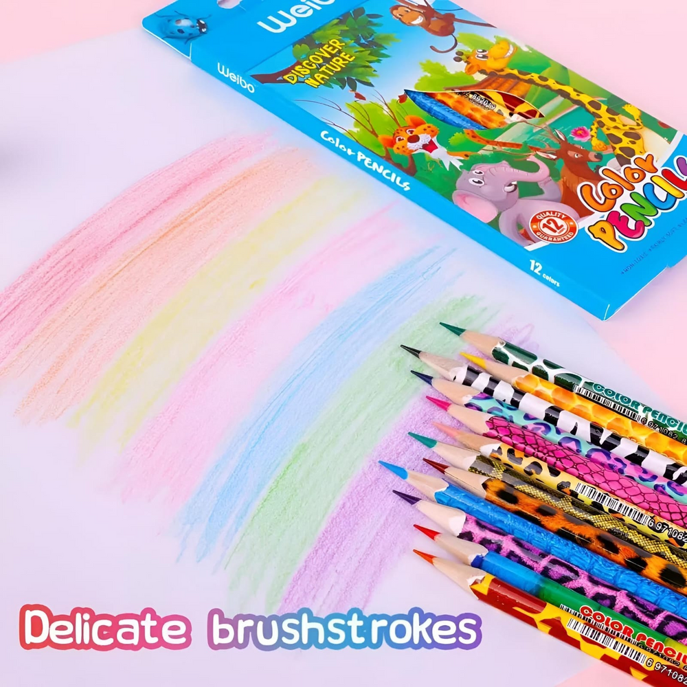 (Caja con 12 unidades de lápices colores surtidos, diseños super divertidos, mina resistente y además su forma triangular permite un fácil agarre para escribir o pintar)