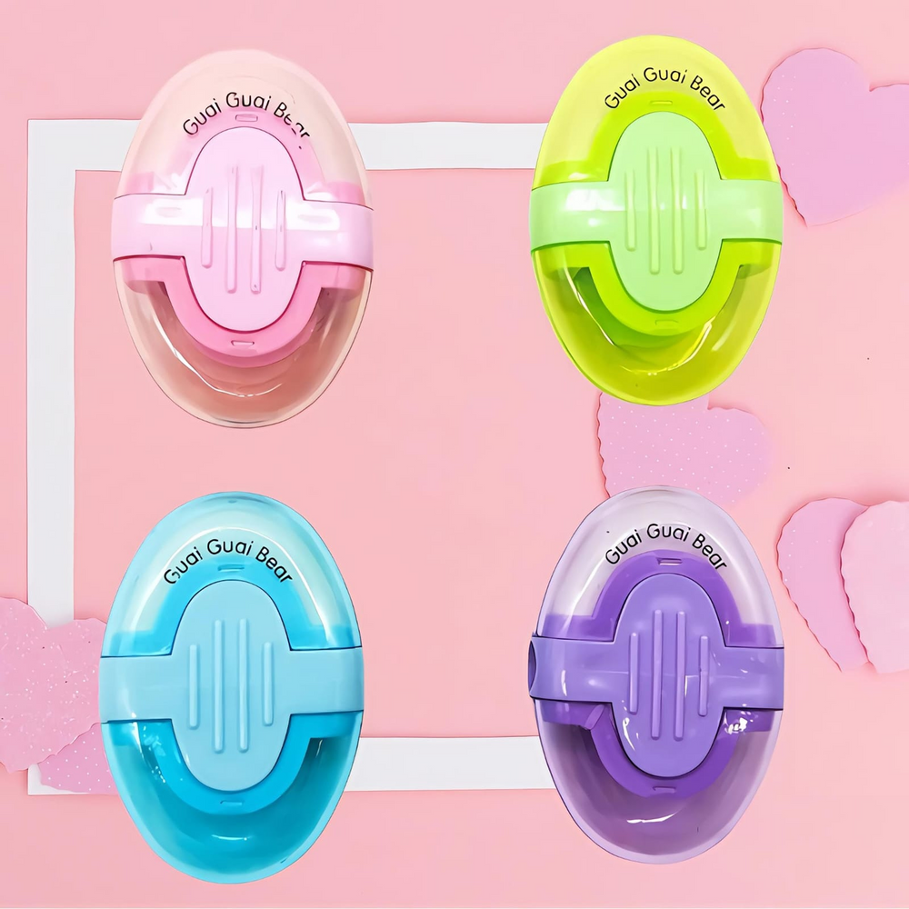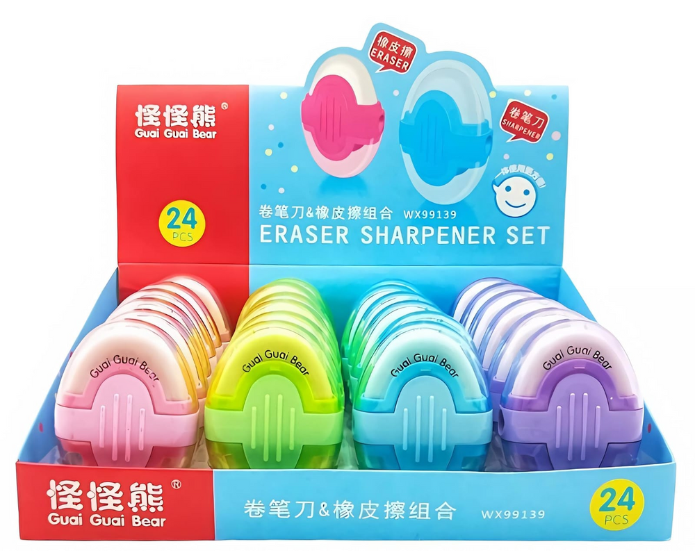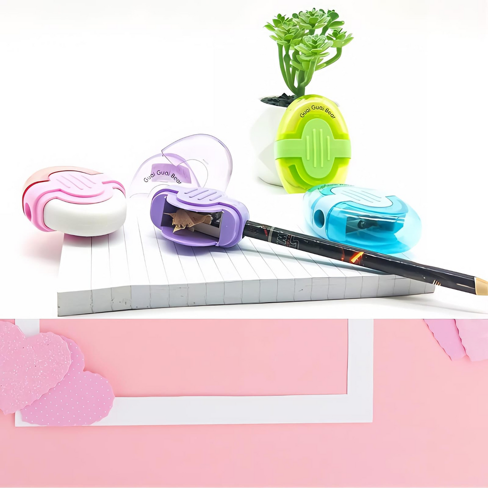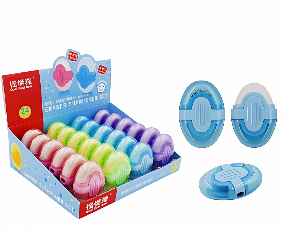 (Sacapuntas más goma, 2 en 1. En un lateral el orificios del sacapuntas y en el extremo el contenedor de basura. En el otro extremo la goma. En 4 colores a elección.)