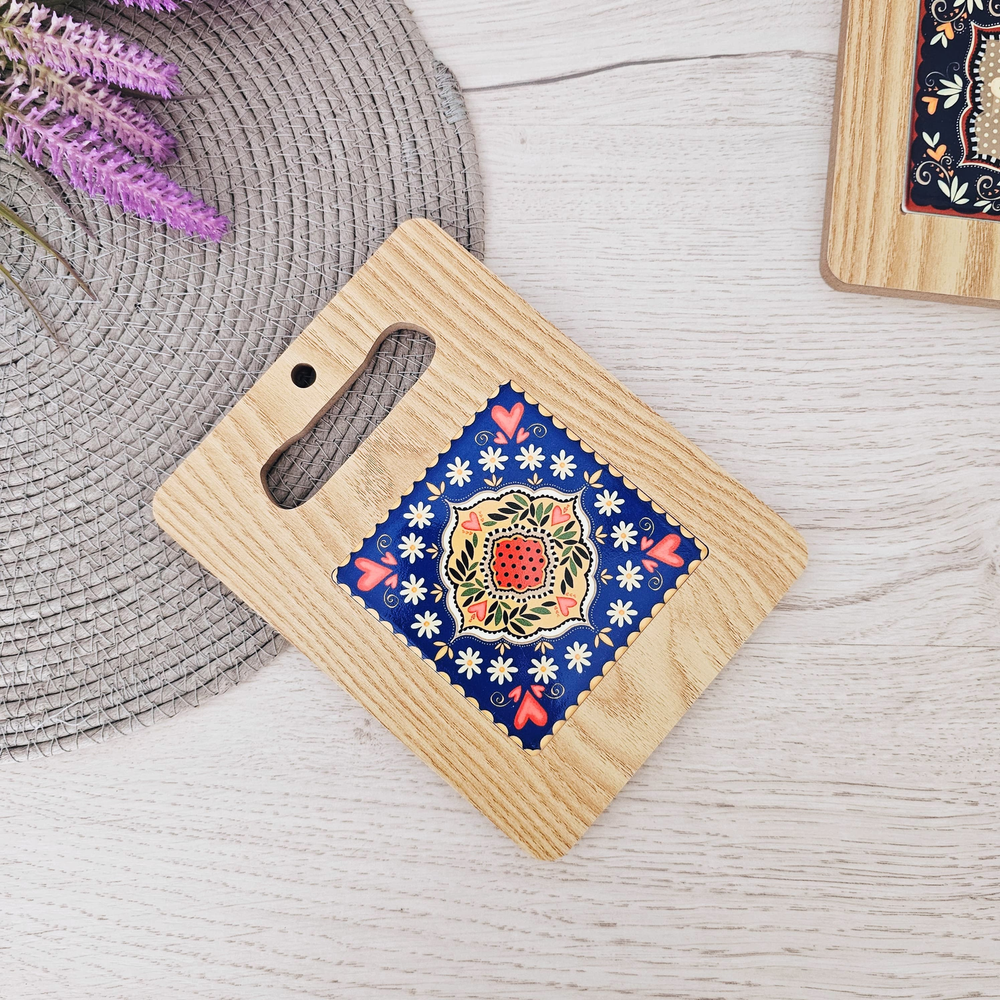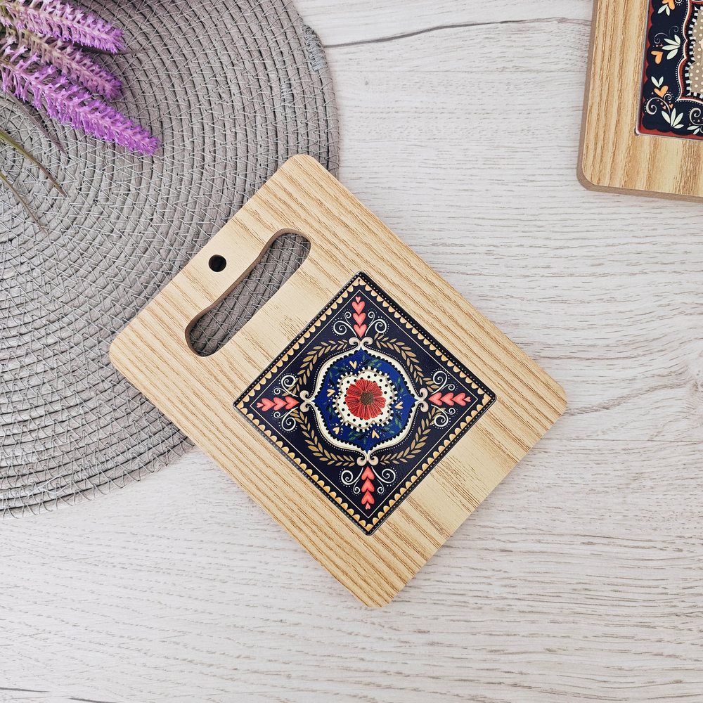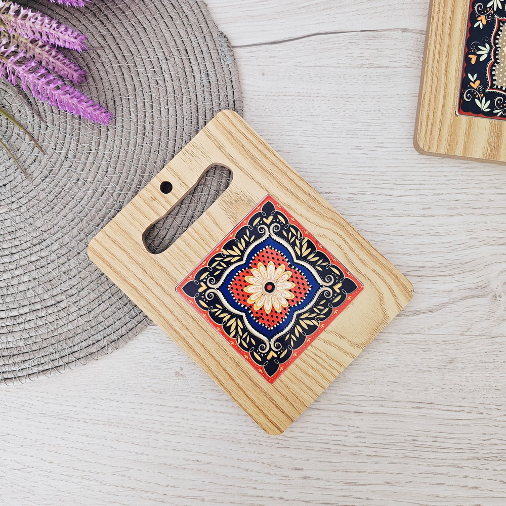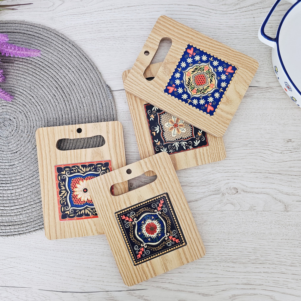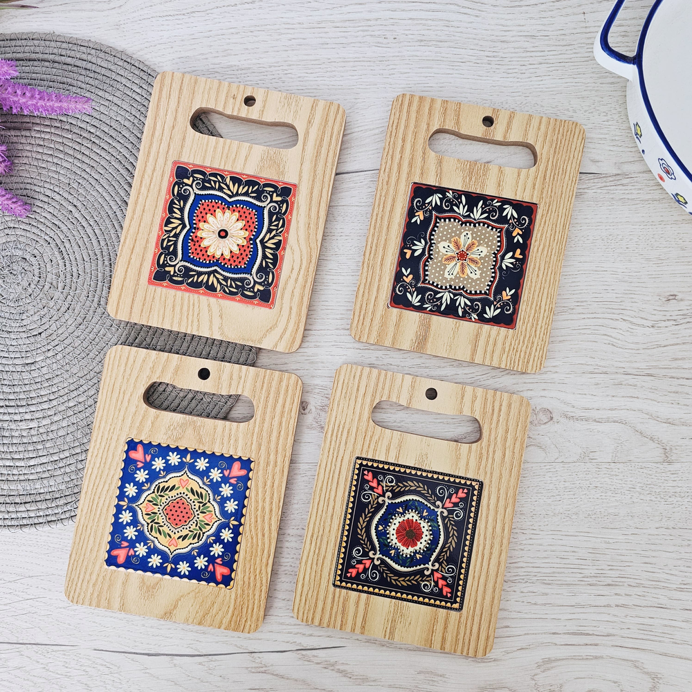 (Posa fuente de madera, con un centro decorado con flores, este posee un aislamiento térmico lo que permite que el diseño no se dañe, tiene en uno de sus lados una hendija para sujetarla o también posee un agujero para ser colgada).