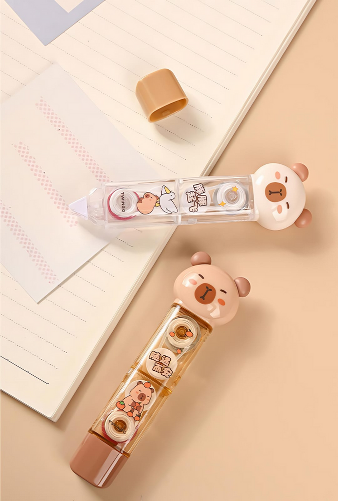 (Este producto cuenta con un tierno diseño de capybara que funciona como cinta de pegar en un extremo y en el otro como cinta correctora. Ideal para regalar).