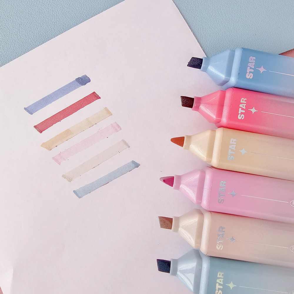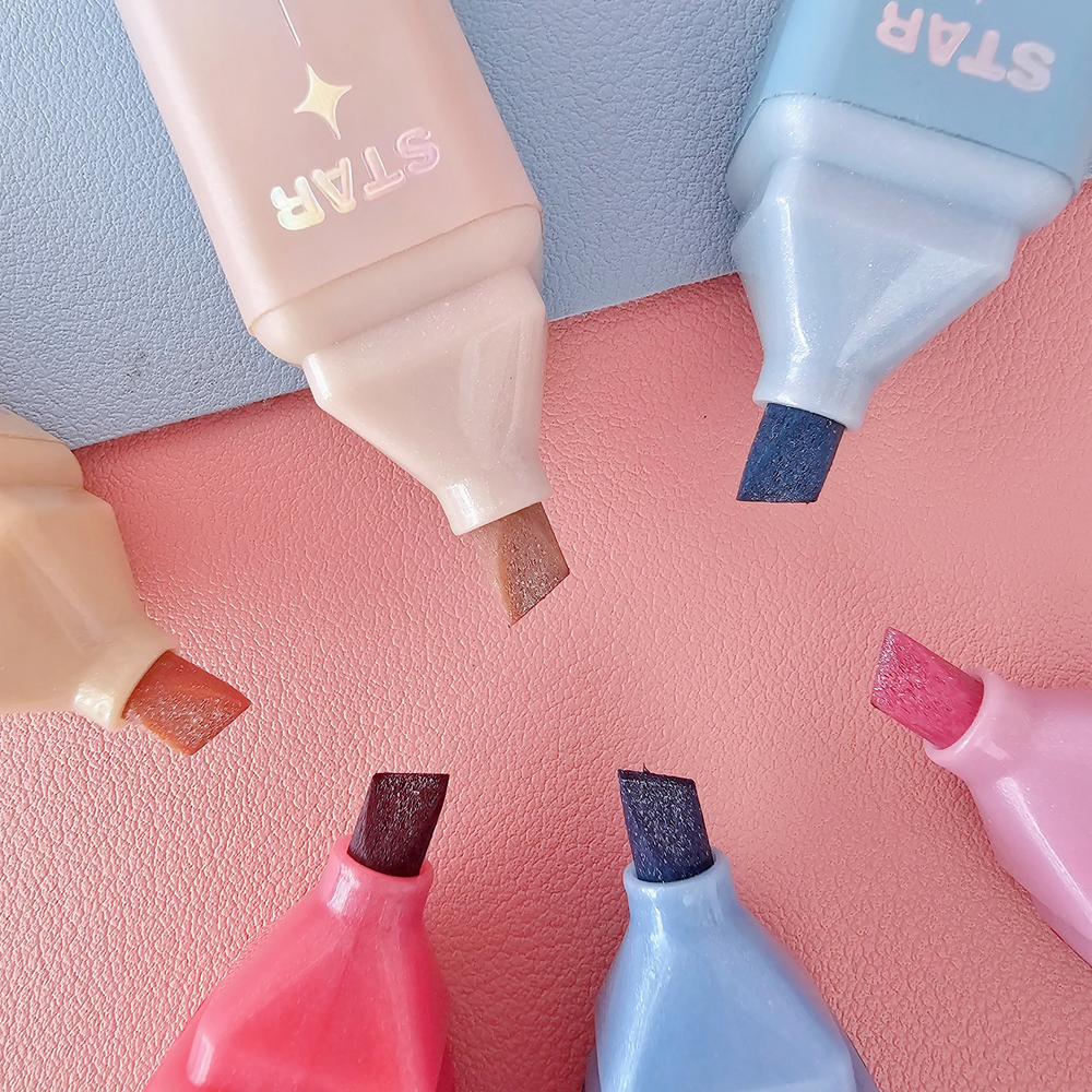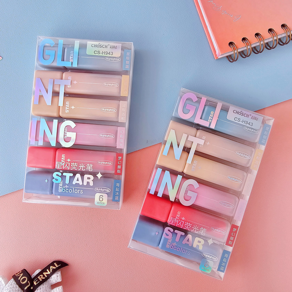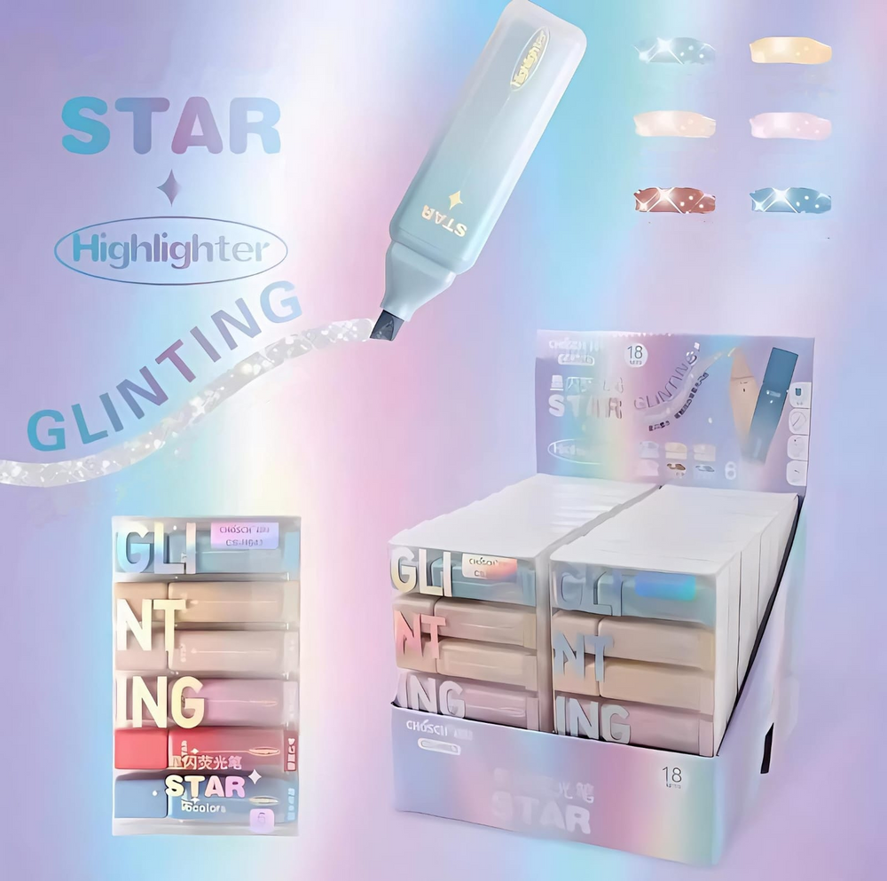 (Set de 6 mini resaltadores con glitter en diferentes tonos pasteles, con un diseño hermoso. Ideal para dar un diseño único y divertido a tus apuntes).