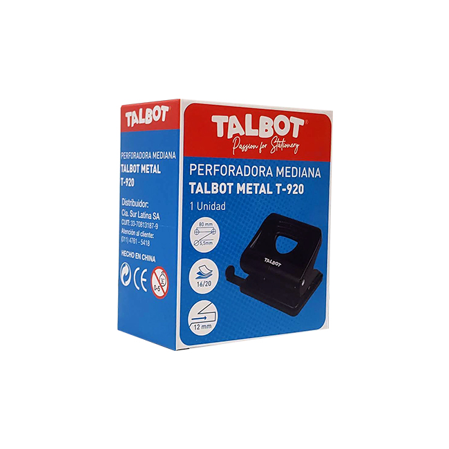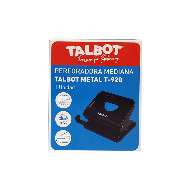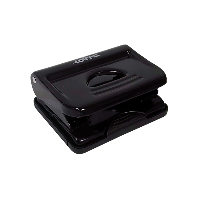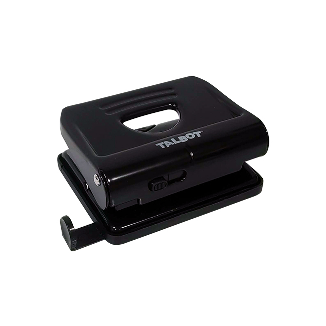 (Perforadora mediana de la marca "talbot", esta hecha de metal de color negro, tiene una excelente calidad de penetración, y optima comodidad de uso. Puede perforar hasta 16 y 20 hojas. Ideal para uso en oficina).