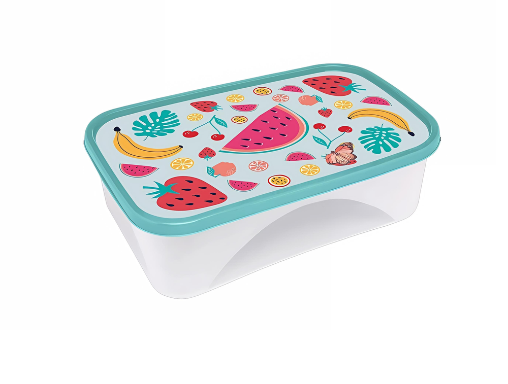 (Tupper ideal para almacenar y transportar alimentos de forma segura y hermética. El diseño de frutas en la tapa le da un toque decorativo y divertido. Está fabricado en plástico, lo que lo hace ligero y fácil de limpiar. Puede ser utilizado para llevar el almuerzo, guardar sobras, o almacenar ingredientes en la heladera).