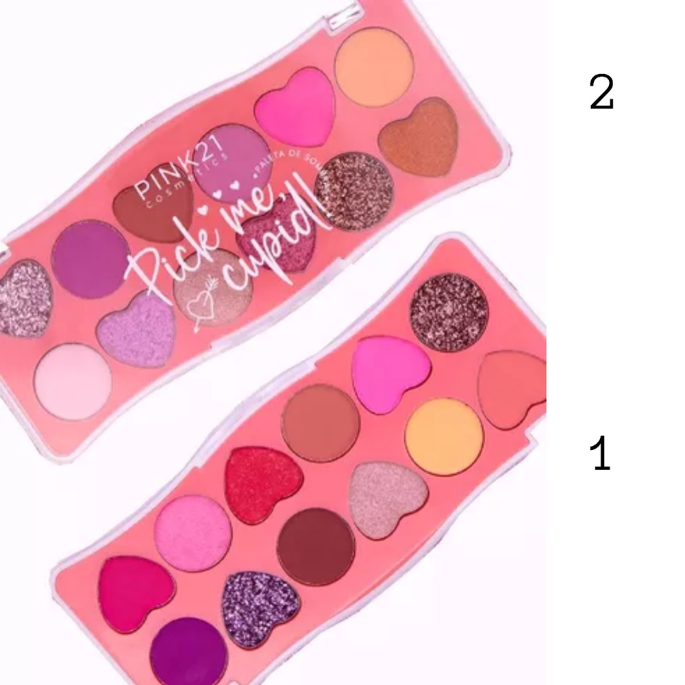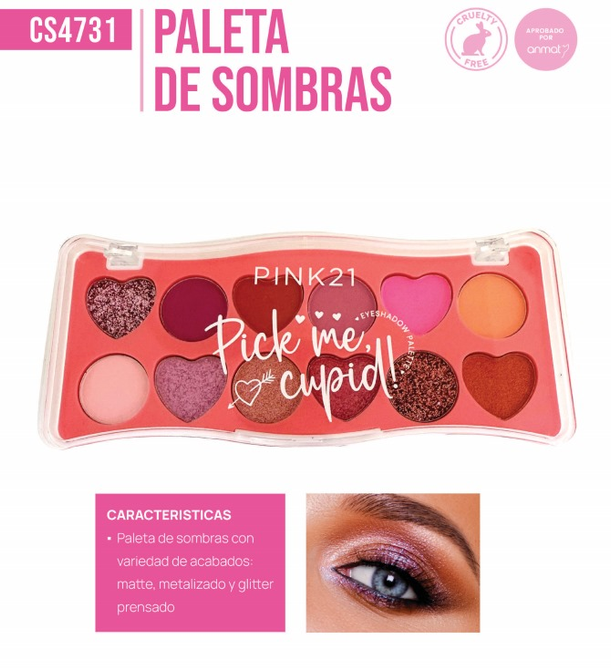 (Paleta de sombras Pick Me Cupid marca "Pink 21". Cuenta con 6 sombras con acabado matte, satinado y glitter. Ideal para resaltar la belleza de tus ojos).
