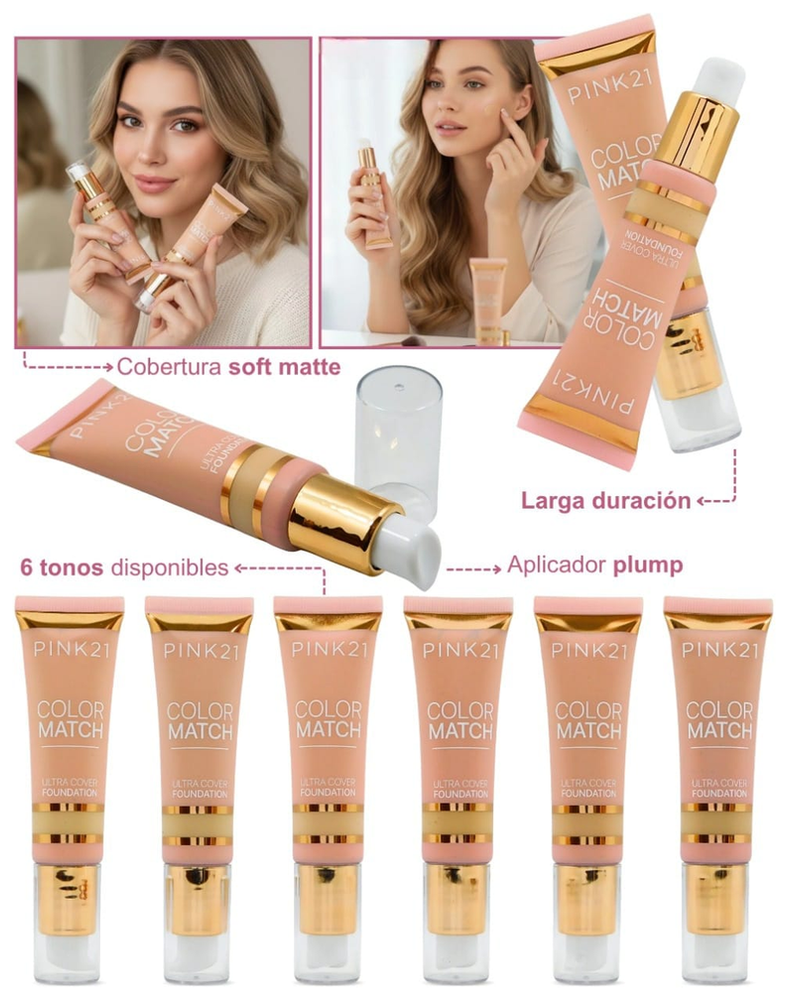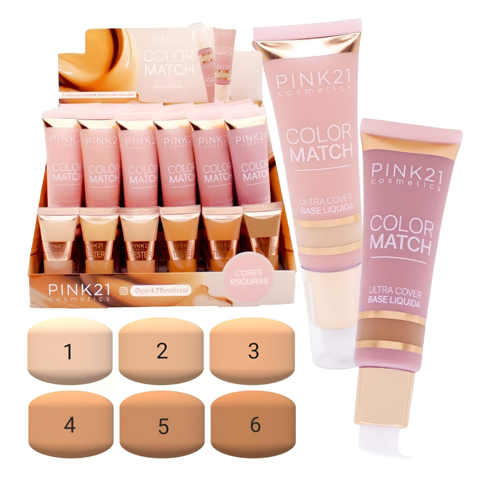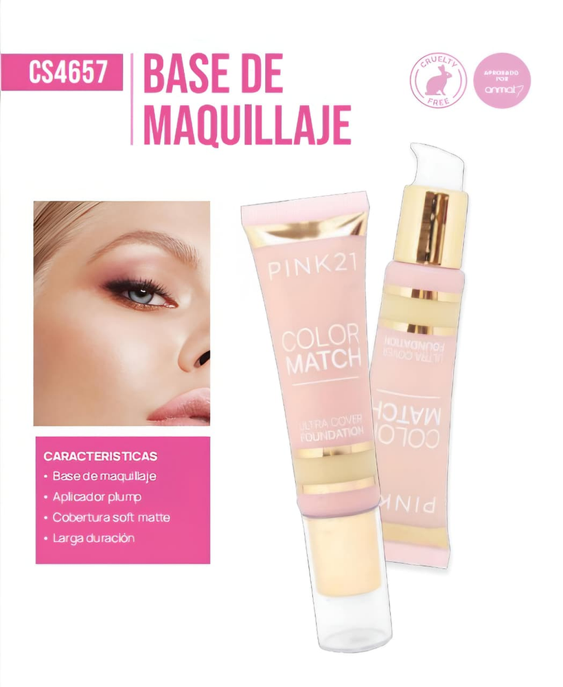 (Base liquida color match marca "Pink 21". Cuenta con una capacidad de cobertura excelente y vienen 6 tonalidades de base diferentes a elección. Ideal para un resultado uniforme, suavizar el tono y la textura de la piel).