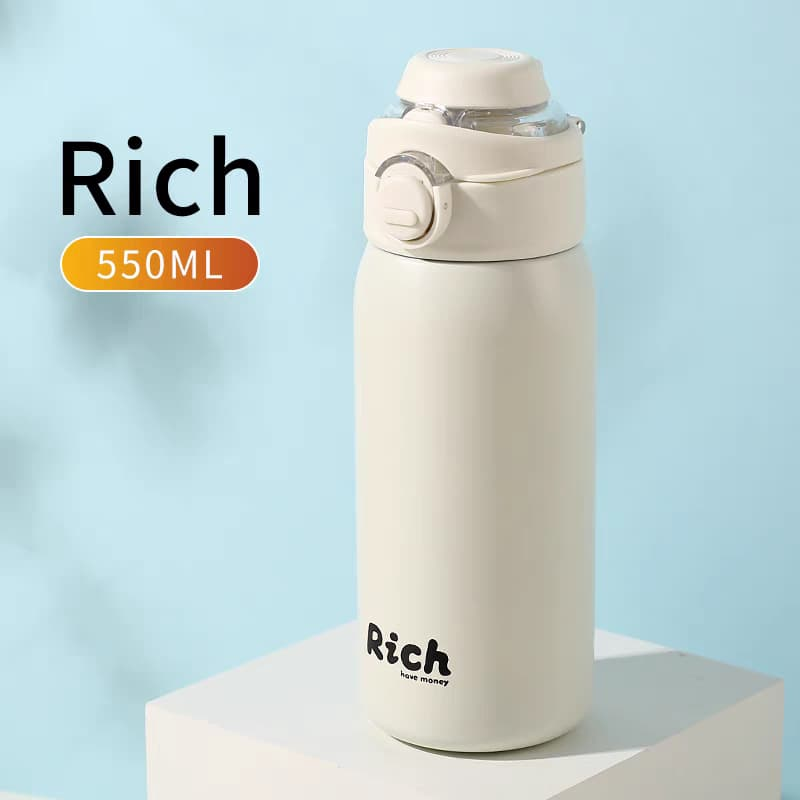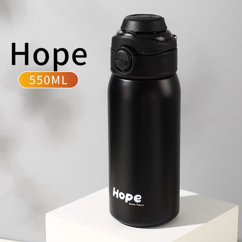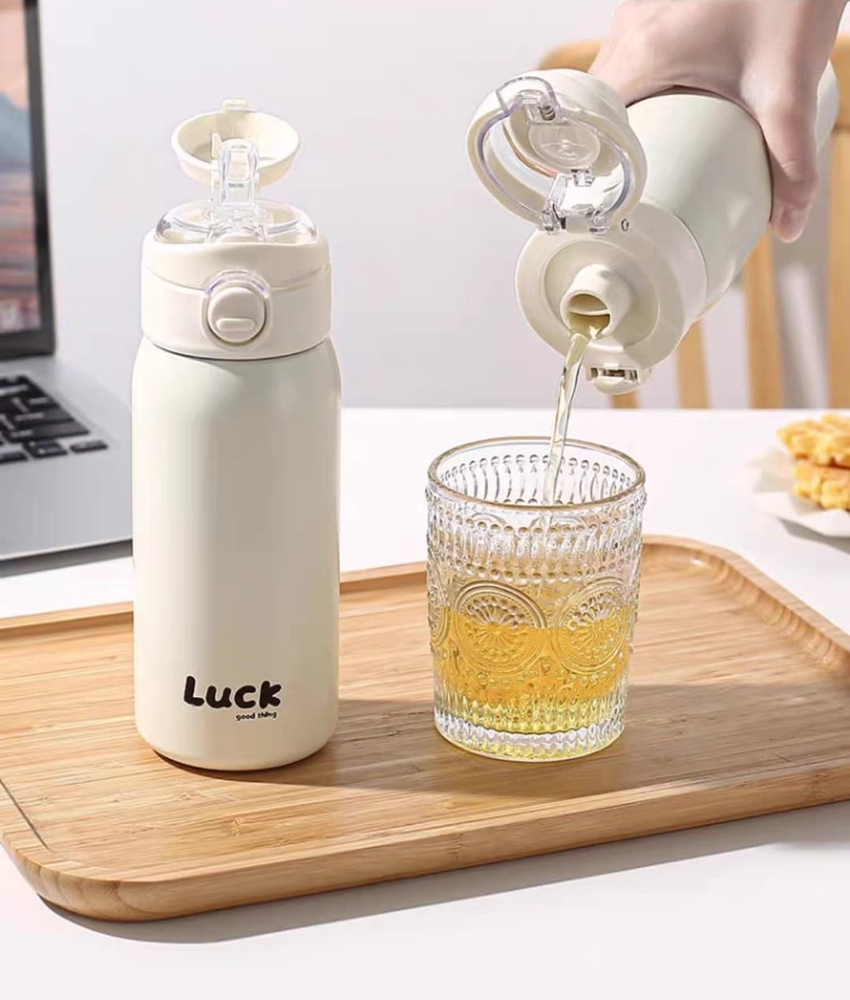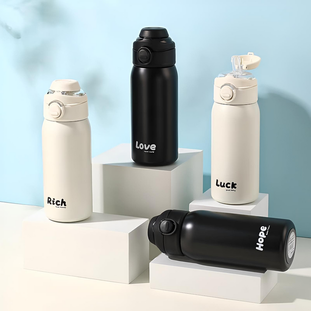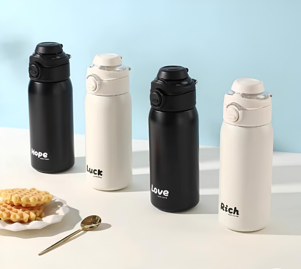 (Botella de acero inoxidable disponible en dos colores , fácil de llevar a cualquier y además cuenta con dos picos y sorbete ). Ut.20