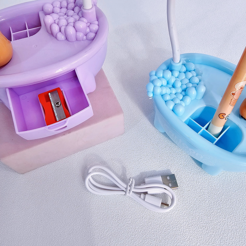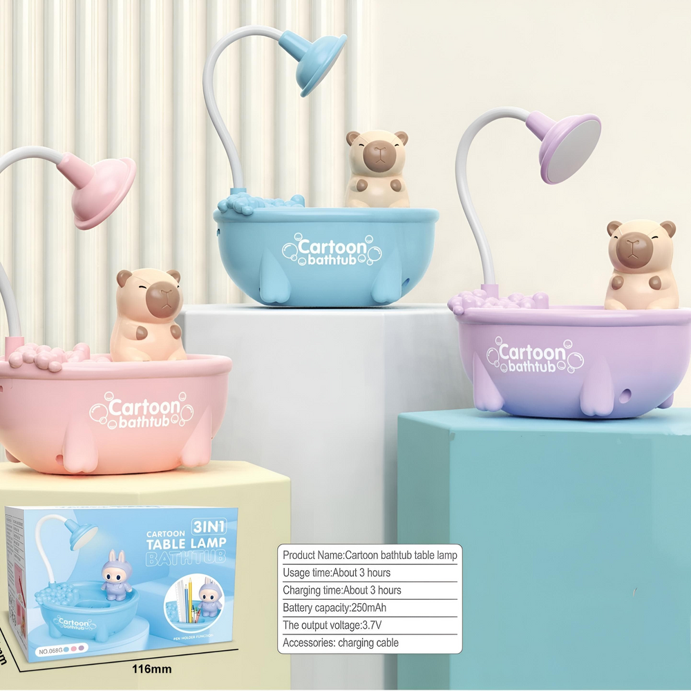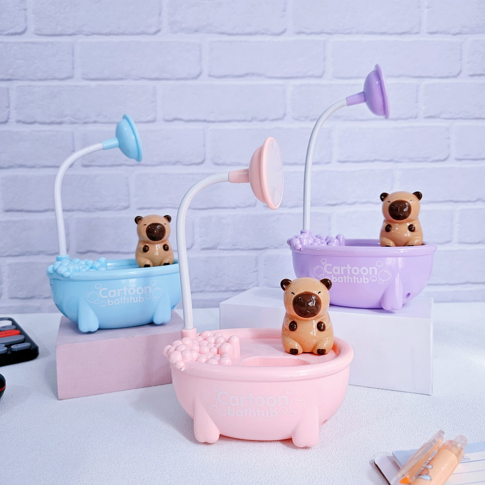 (Lampara led con diseño de bañera, cuenta con un pequeño Capybara como decoración . También tiene 5 divisiones y en su parte trasera un sacapuntas con contenedor de basura. Su brazo flexible le permite situar la luz donde le sea cómodo.Con cable USB incluido.)