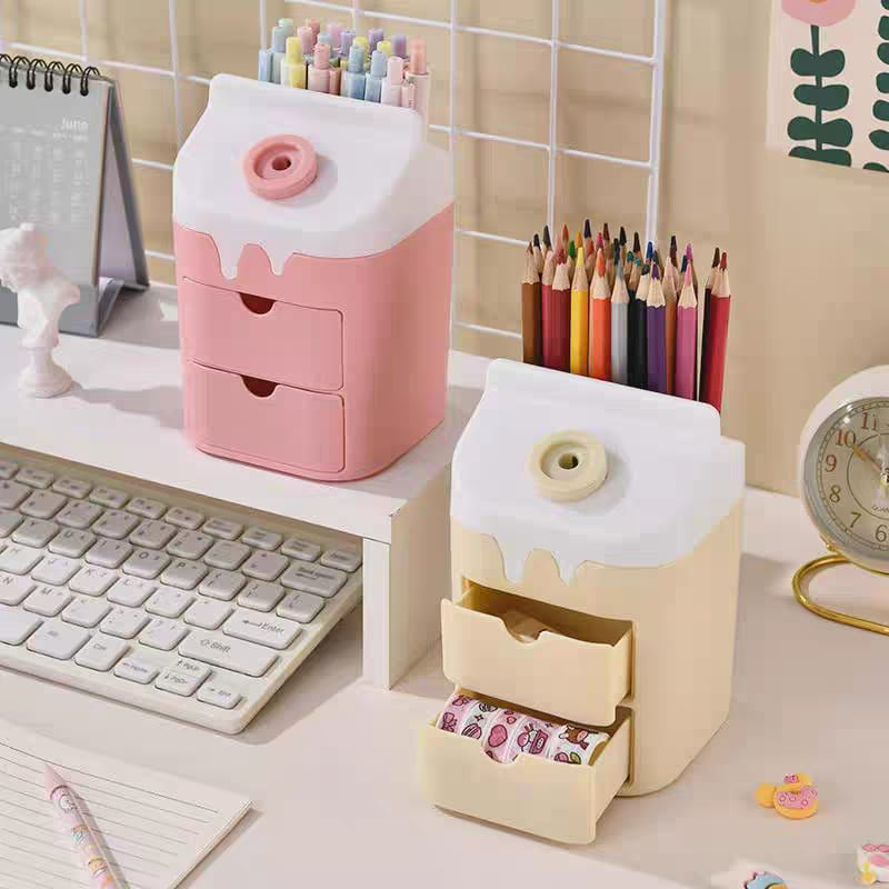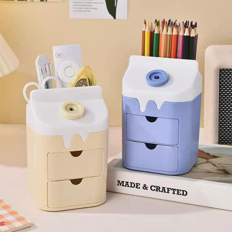 (Cuenta con un hermoso diseño y posee 2 cajones, un sacapuntas y un compartimiento ideal para almacenar lápices, pinceles, brochas, entre otros).