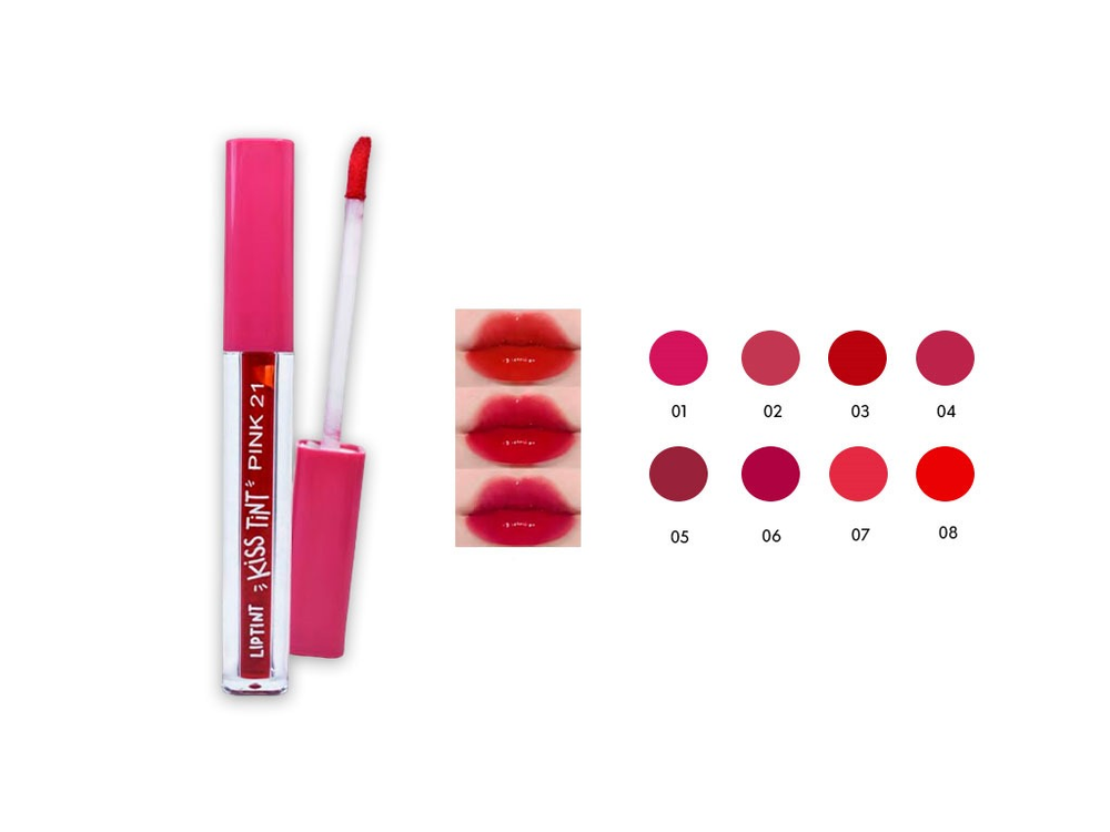 (Brillo labial Kiss Tint marca "Pink 21". Vienen 8 modelos diferentes a elección y tiene una capacidad de 2,5Ml, aprox, Son de larga duración y aprueba de agua . Ideal para darle color a tus labios con un look natural).