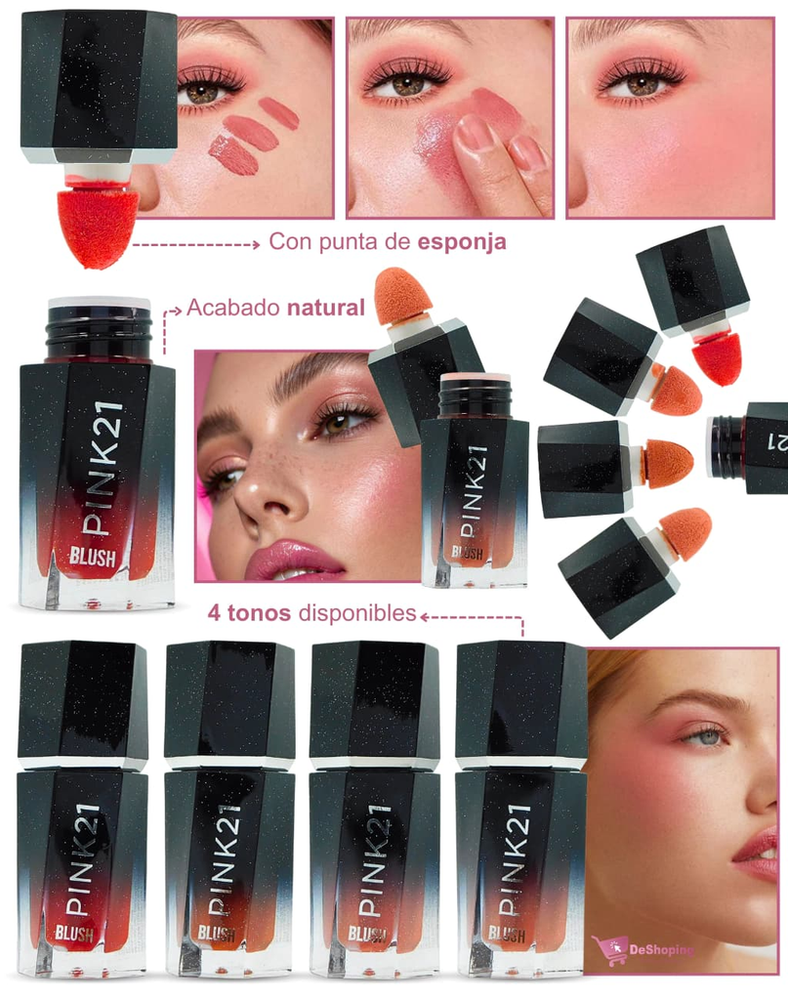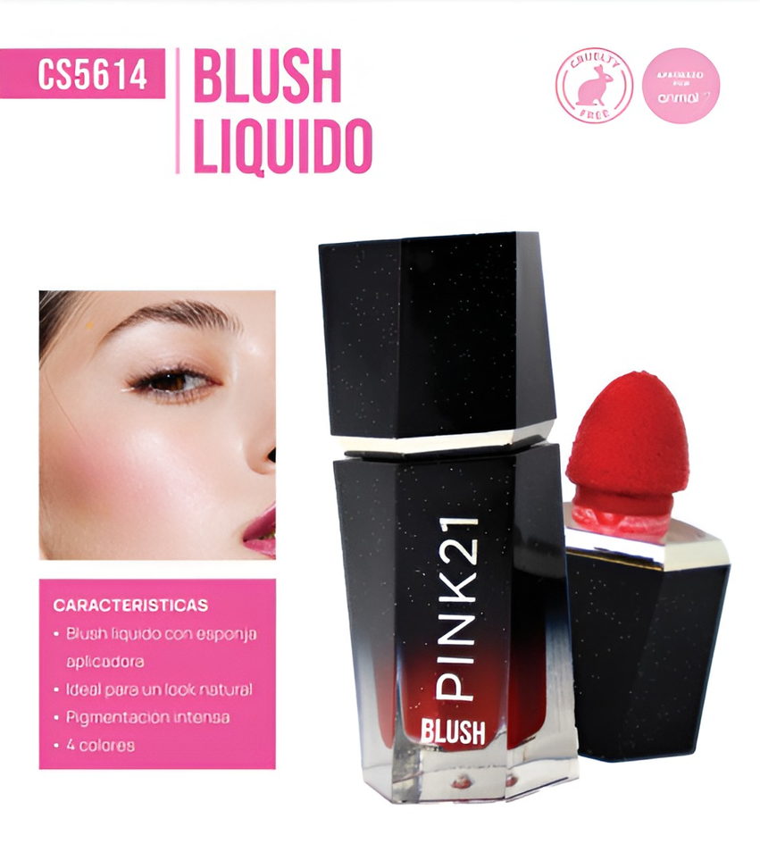 (Rubor Liquido "Pink 21", posee 4 tonos diferentes a elección. Ideal para resaltar tu maquillaje y belleza natural).