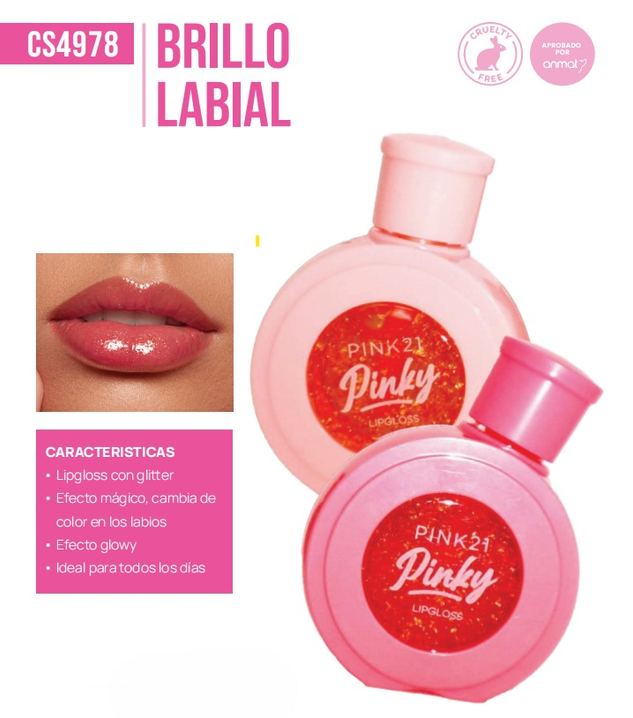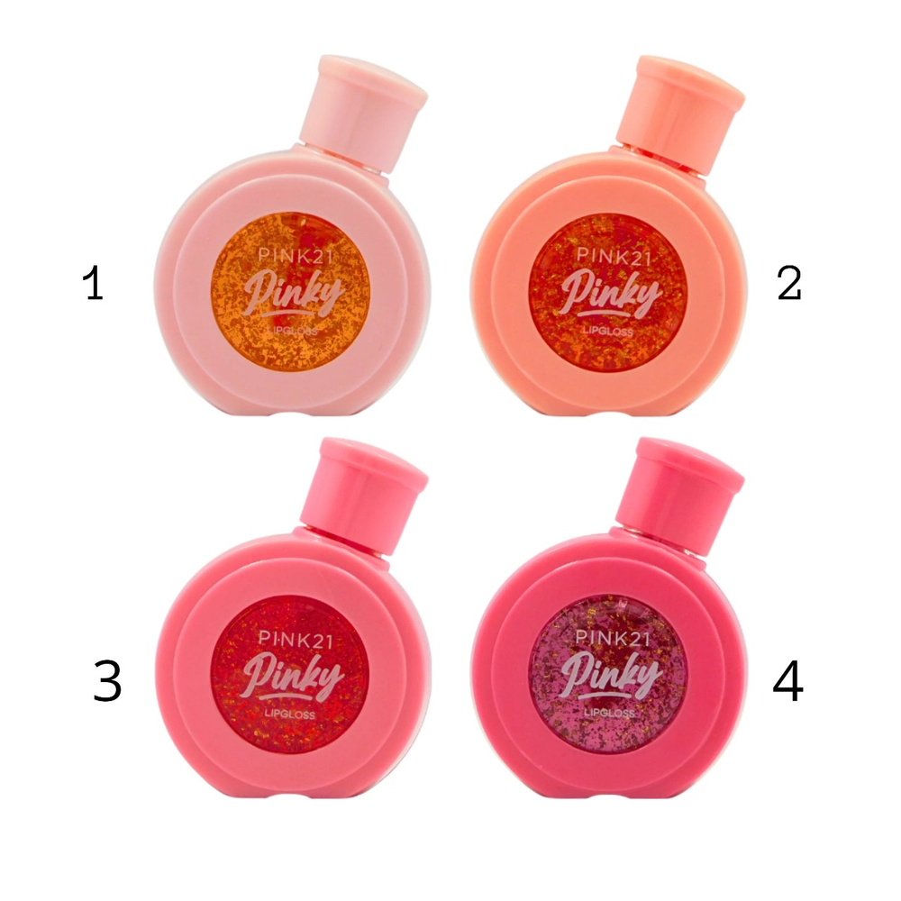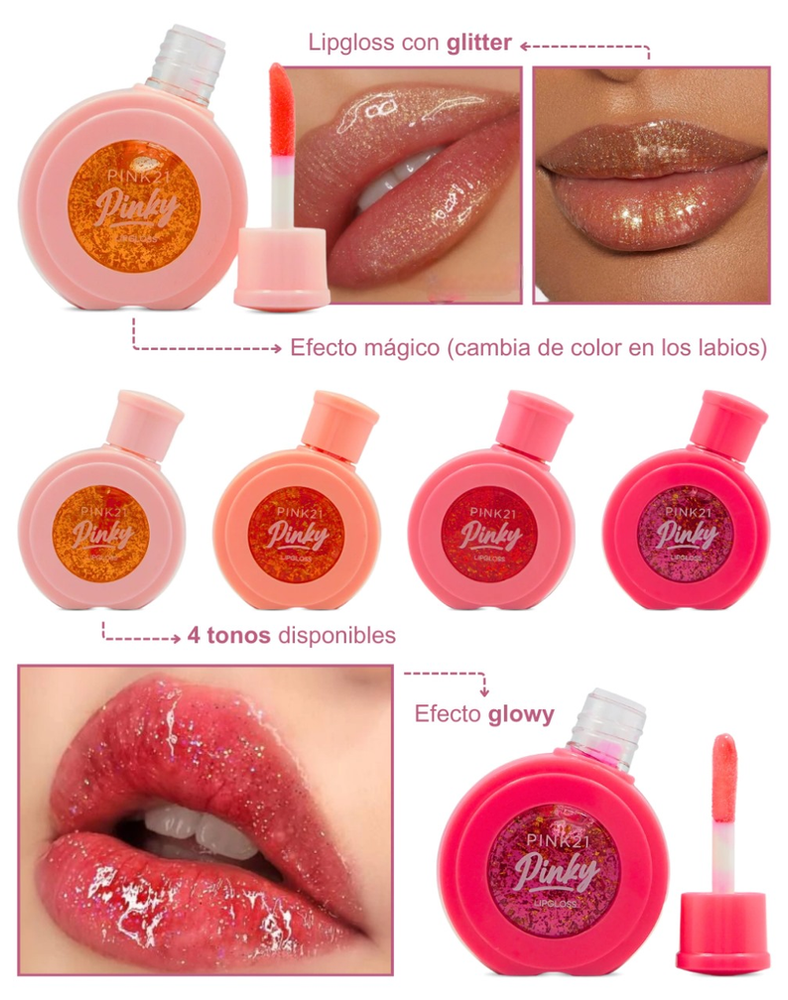 (Brillo labial líquido marca "Pink 21". Cuenta con una capacidad de 8ml y vienen 4 tonalidades diferentes a elección. Ideal para aporta brillo, volumen y hidratación a los labios).