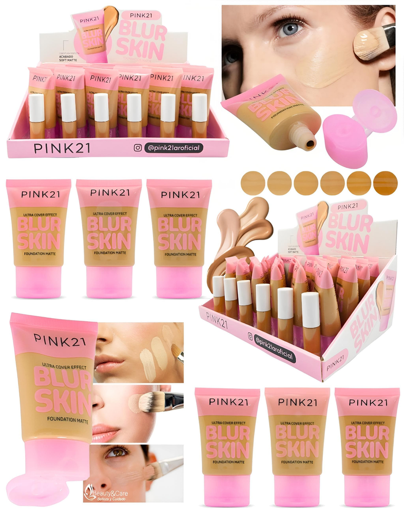 (Base liquida con efecto glowy marca "Pink 21". Cuenta con una capacidad de cobertura excelente y vienen 6 tonalidades de base diferentes a elección. Ideal para un resultado uniforme, suavizar el tono y la textura de la piel).