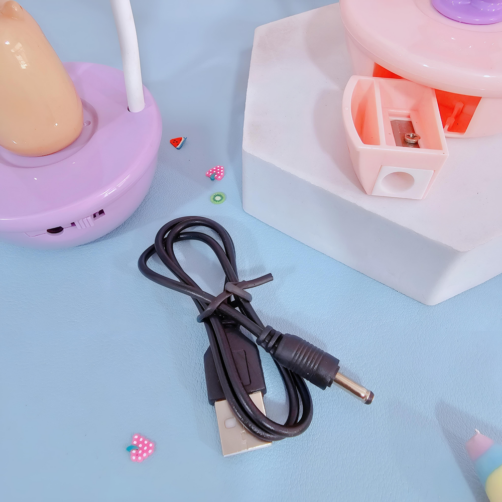 (Cuenta 2 modos: . Posee un sacapuntas con depósito en su base y se carga mediante un cable USB (incluido). Ideal para alumbrar tu mesa de noche o escritorio).