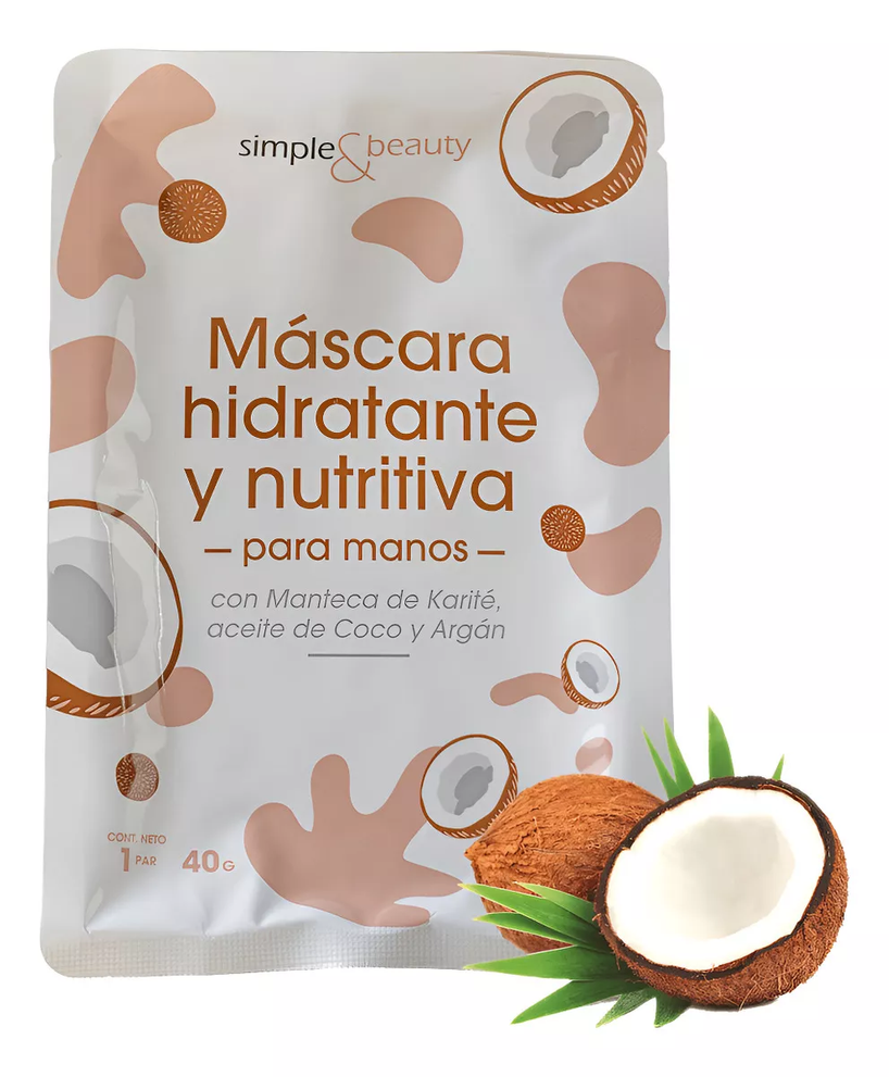 (Máscara hidratante y nutritiva para manos, marca "Simple & Beauty". Repara, suaviza, restaura la flexibilidad y elasticidad de tus manos. Aceite de Argán que aporta vitamina A. E Y Omega 6, dando suavidad y firmeza a las uñas y piel).