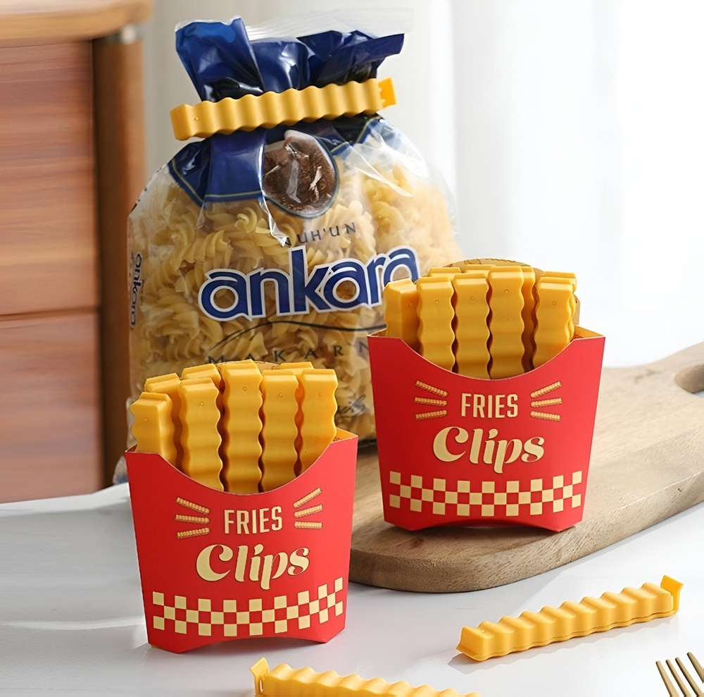 (Ganchitos en forma de papa frita cierra bolsa, su estuche cuenta con un imán para poner en la heladera y así poder tenerlo siempre a mano. ideal para mantener los alimentos cerrados impidiendo que se arruinen, fácil de usar)